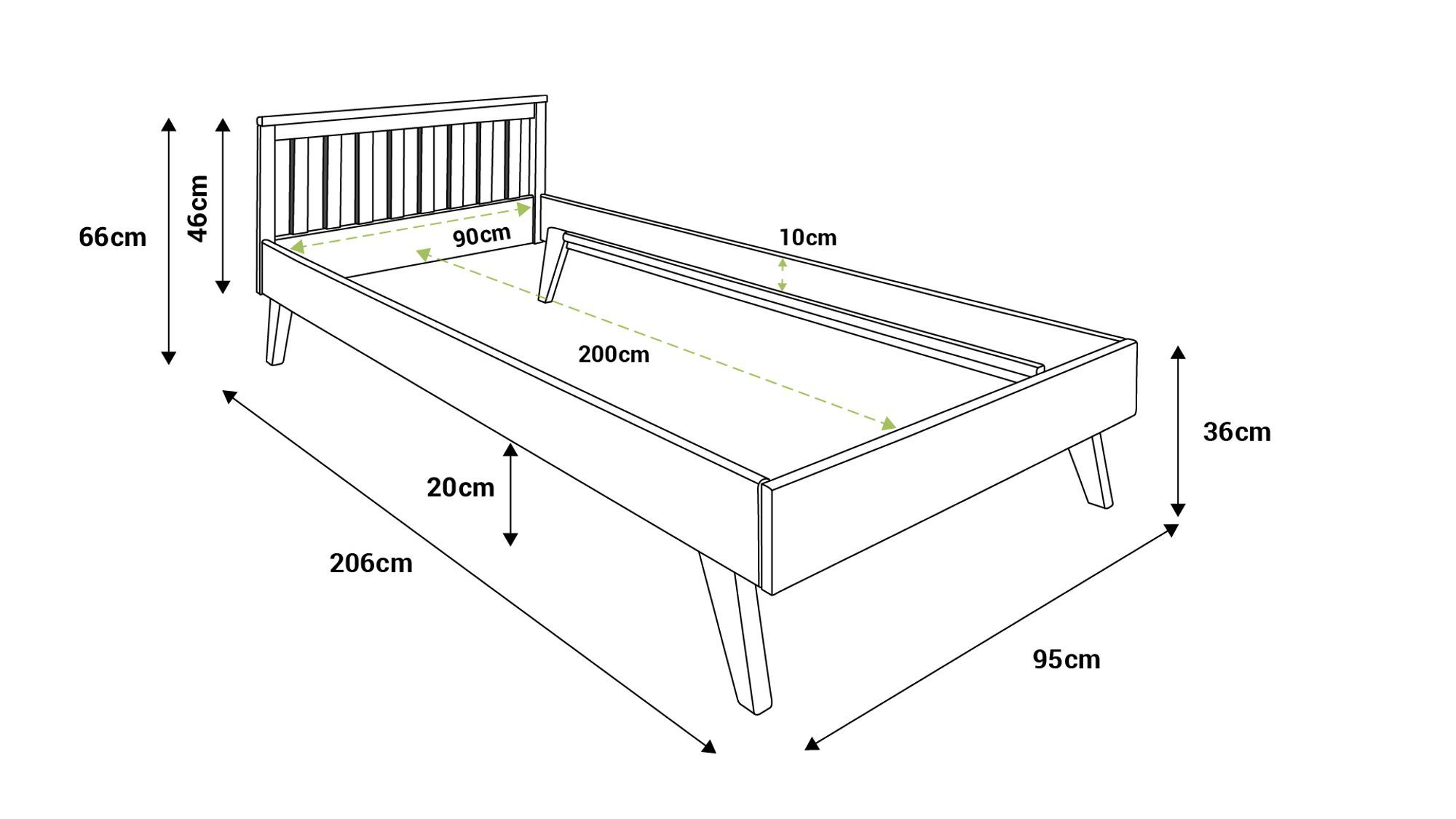 - Kinderbett Laura 90x200 cm: stilvolles Design, schräg angesetzte Füße, mit elegantem Kopfteil in der Höhe 46 cm