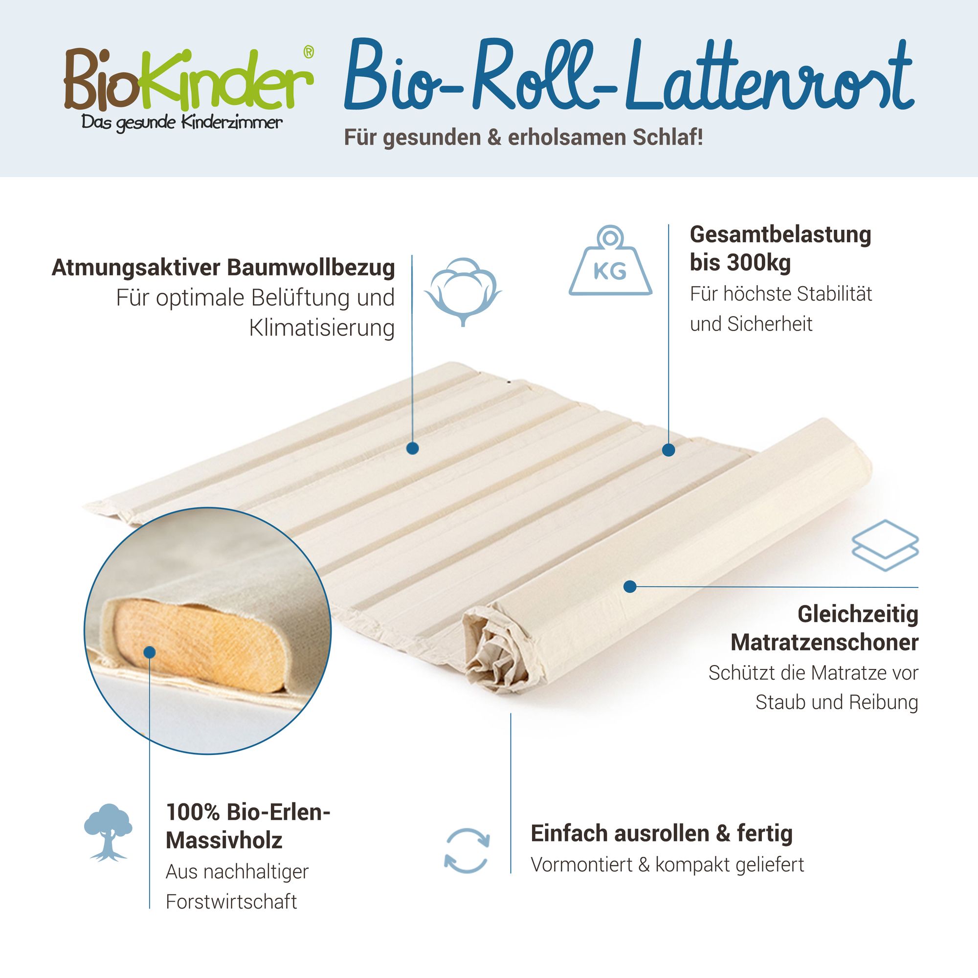 - Roll-Lattenrost: massive Holzleisten im atmungsaktiven Baumwollbezug, für ergonomisches Liegen, schont die Matratze