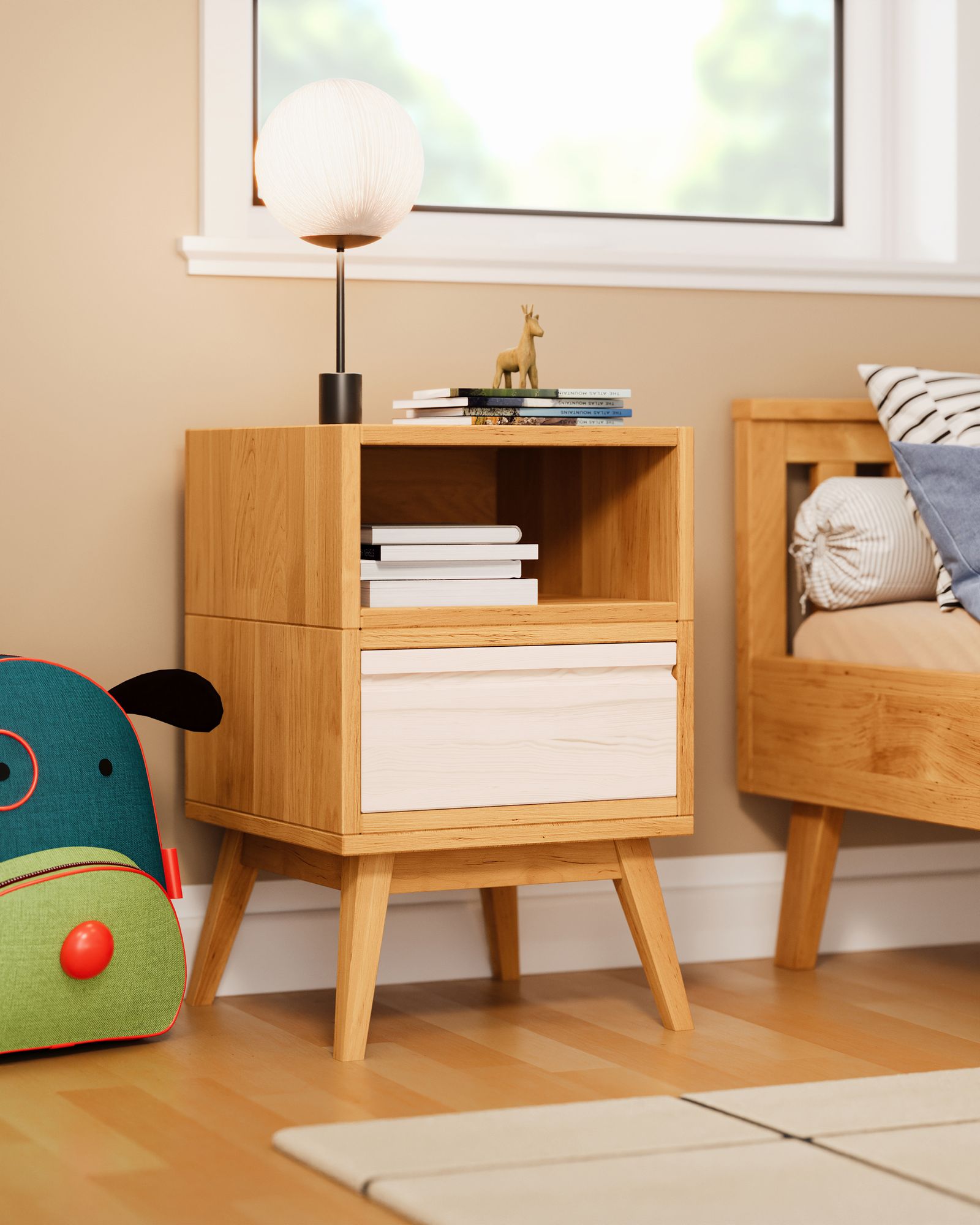 Das Massivholz stammt aus zertifizierter Forstwirtschaft. Gefertigt aus Bio-Erlenholz (natur) und Bio-Kiefernholz (weiß und bunt lasiert). Die Beschaffenheit jedes Möbelstücks wird nur bei BioKinder durch bioola® nature Öl bzw. bioola® colour Lasur aus natürlichen Erd- und Mineralpigmenten und pflanzlichem Carnaubawachs erhalten und speichel- sowie schweißecht natürlich veredelt.