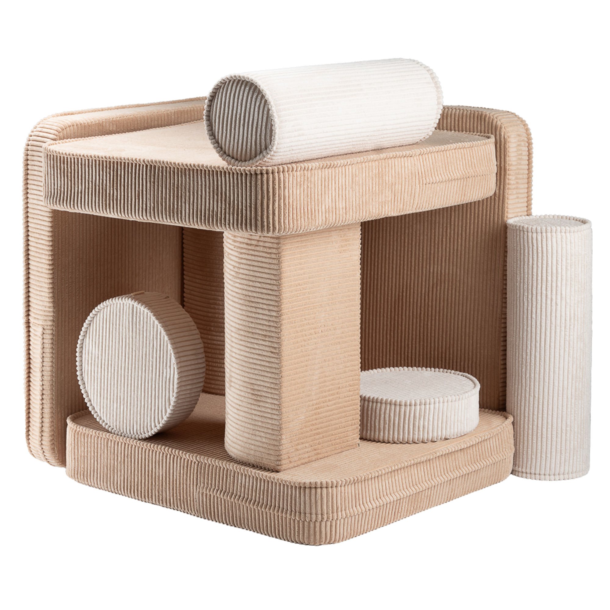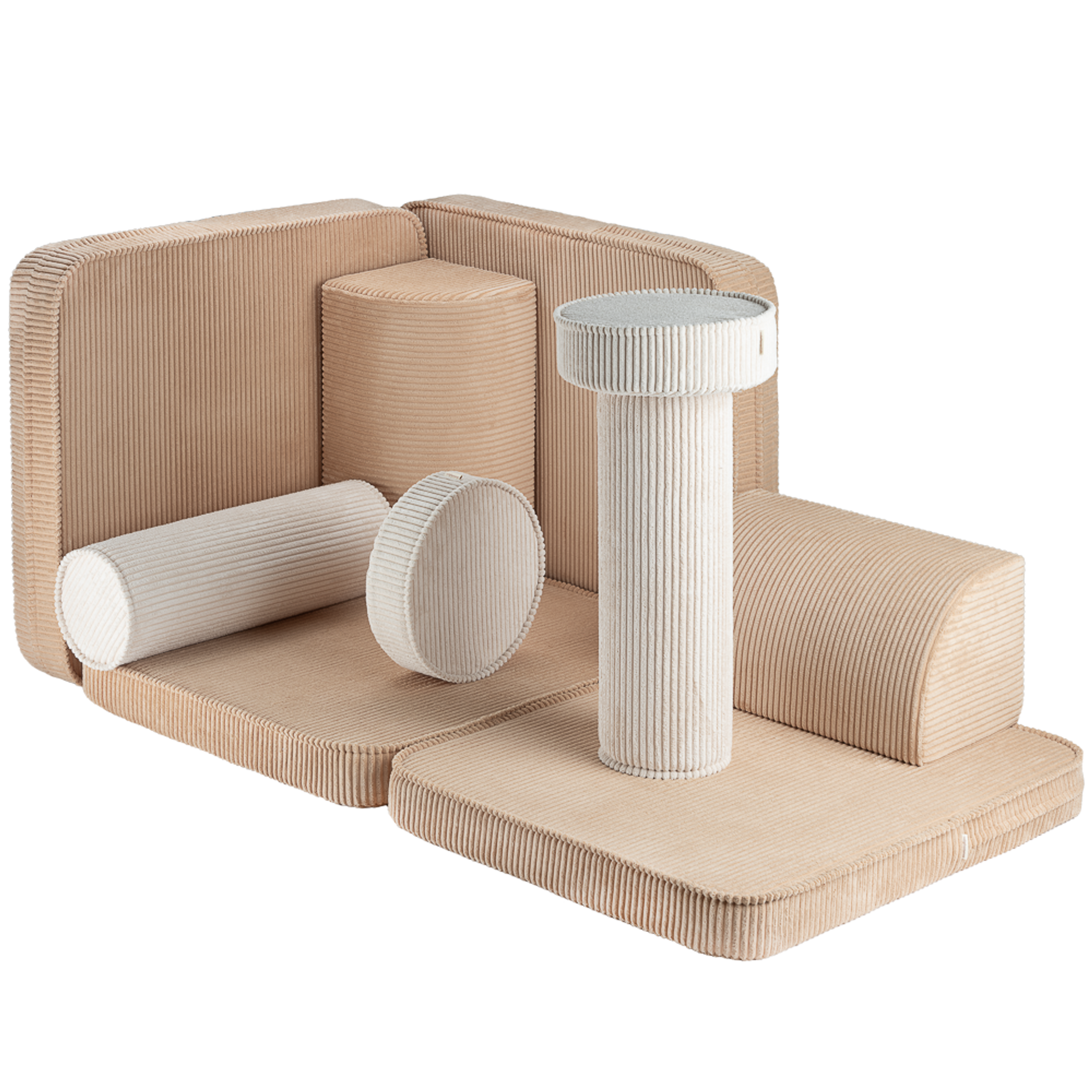 Das Sofa besteht aus 10 Teilen - zwei kleine Sitzkissen, zwei große Sitzkissen, zwei dreieckige Kissen als Rückenlehnen, zwei Rollkissen als Armlehnen und zwei runde Kissen - eine perfekte Kombination mit grenzenlosem Potenzial für fantasievolles Spiel und Entspannung. Das Spielsofa ist nicht nur ein Möbelstück - es ist eine Einladung in eine Welt voller Freude und Entdeckungen!