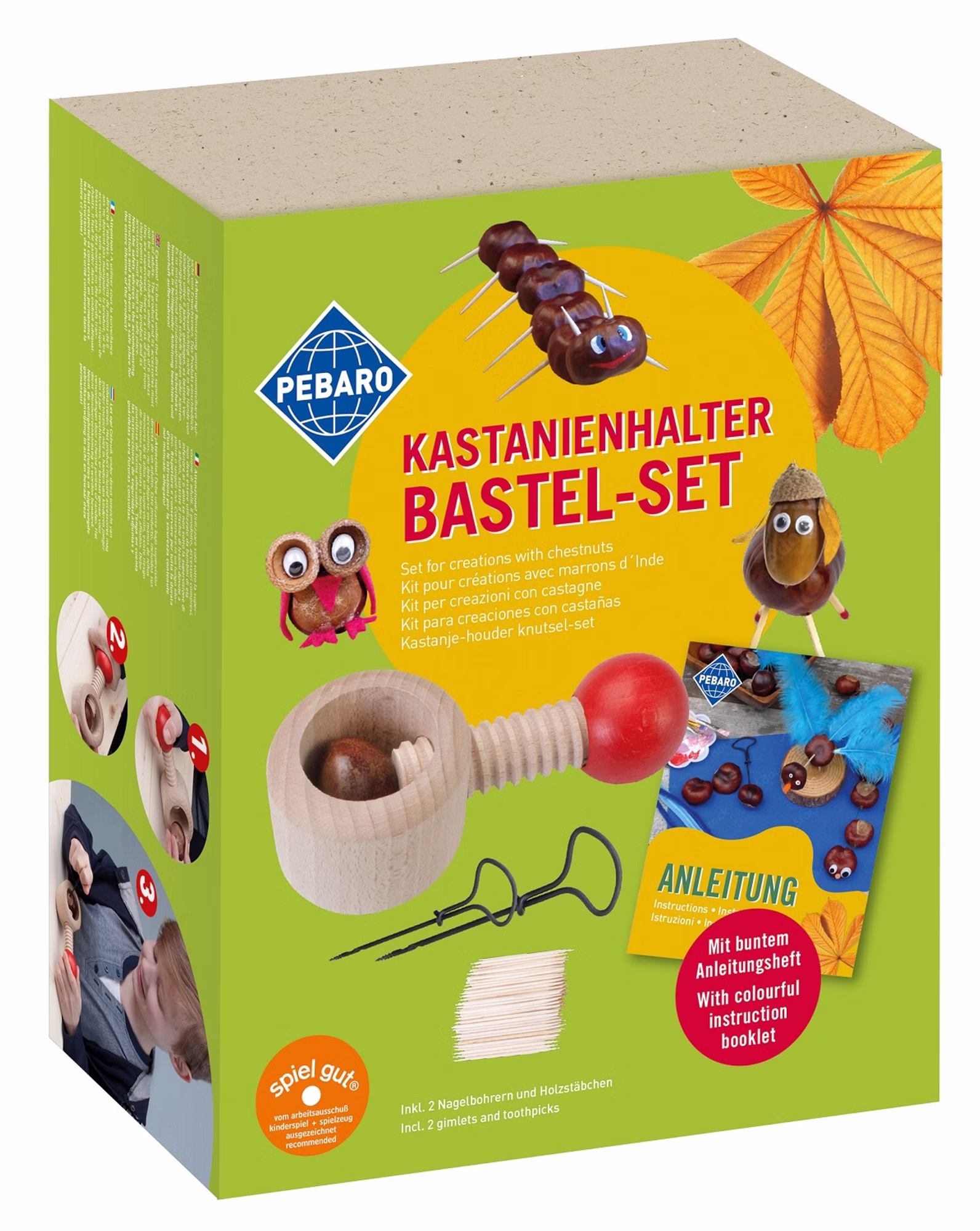 Mit dem Kastanien- Bastelset wird das Basteln mit Kastanien besonders einfach, sicher und vielseitig. Das Set eignet sich ideal, um lustige Kastanienmännchen, Tiere und fantasievolle Figuren zu gestalten. Dank des praktischen Kastanienhalters lassen sich Kastanien sicher fixieren, sodass Löcher mühelos und ohne Verletzungsgefahr gebohrt werden können.