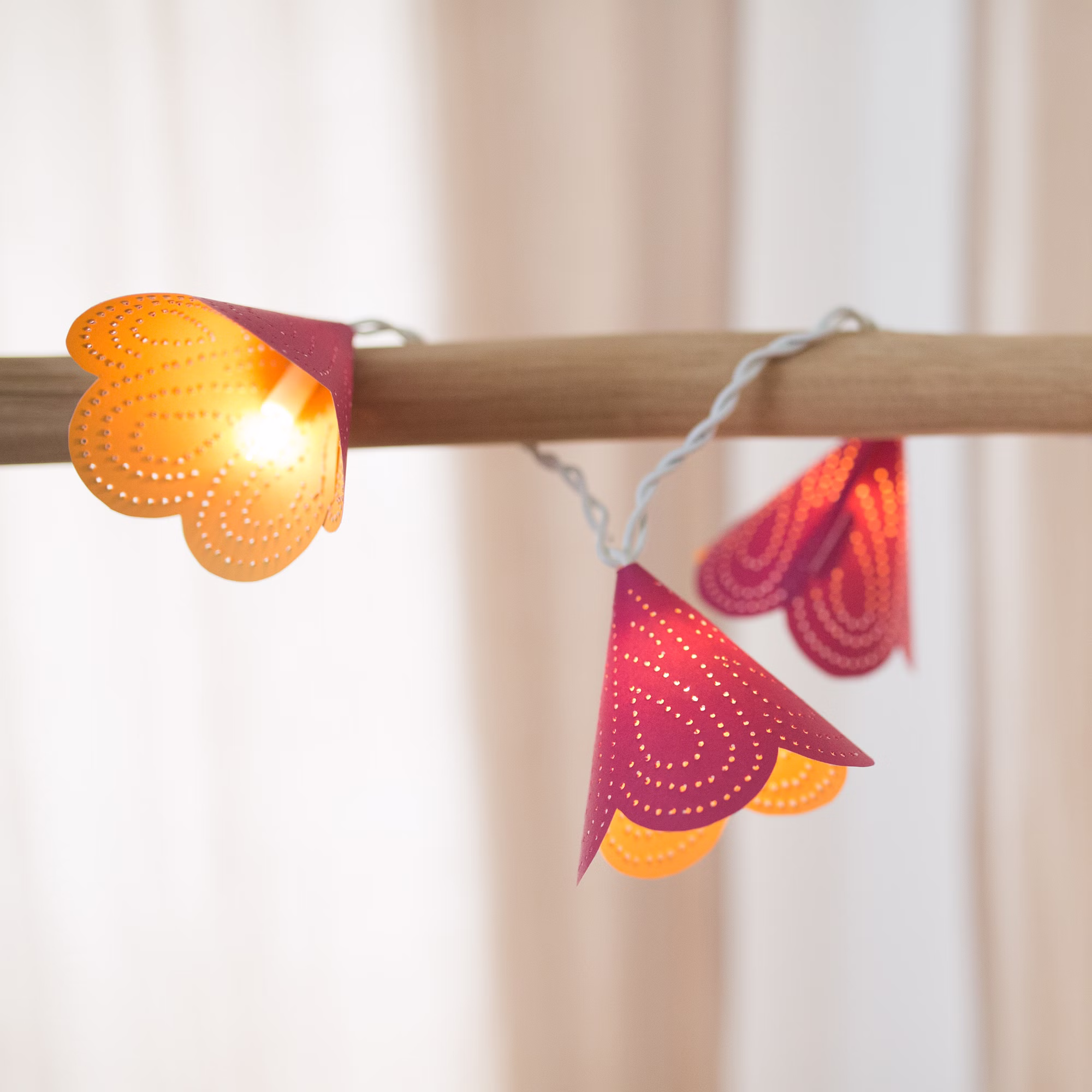 Mit diesem liebevoll gestalteten Bastelset lässt sich ganz einfach eine stimmungsvolle Lichterkette mit dekorativen Blüten-Lampenschirmchen basteln.