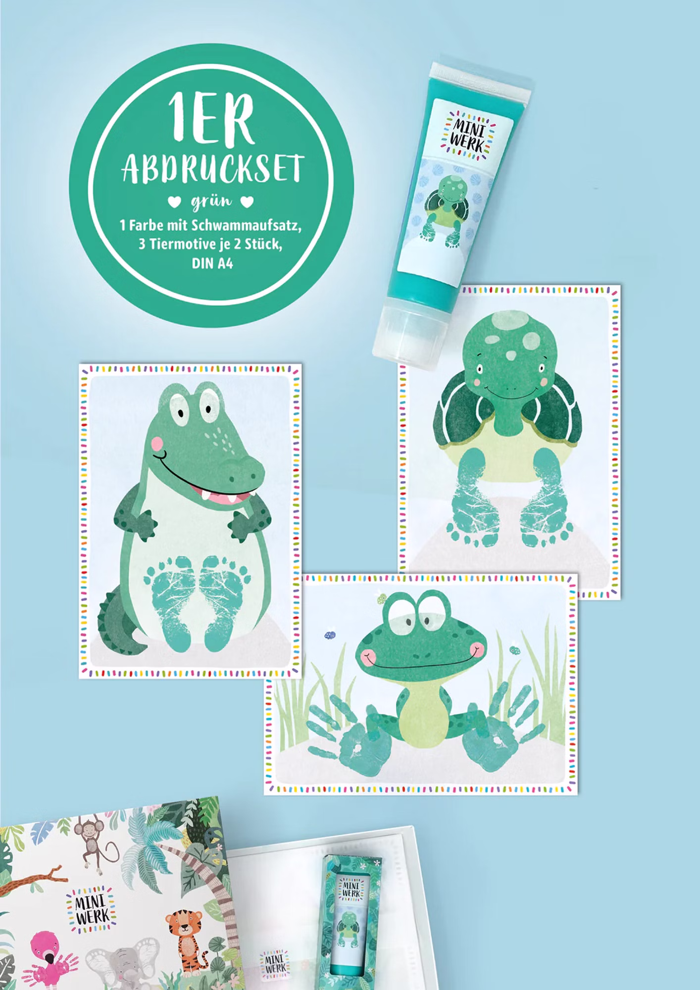 Mit den Abdrucksets sind der Fantasie keine Grenzen gesetzt: Ob zum Festhalten erster Hand- oder Fußabdrücke, zum Malen, Stempeln oder freien Gestalten – jedes Set lädt zum gemeinsamen Entdecken und Kreativsein ein. Die beiliegenden Tier-Motivkarten aus festem Naturkarton können, je nach Motiv, liebevoll mit Hand-, Finger- oder Fußabdrücken ergänzt und zu individuellen Kunstwerken ausgearbeitet werden. Sie verleihen den Abdrücken des Kindes einen ganz besonderen Rahmen und werden so zu wertvollen Erinnerungsschätzen.
