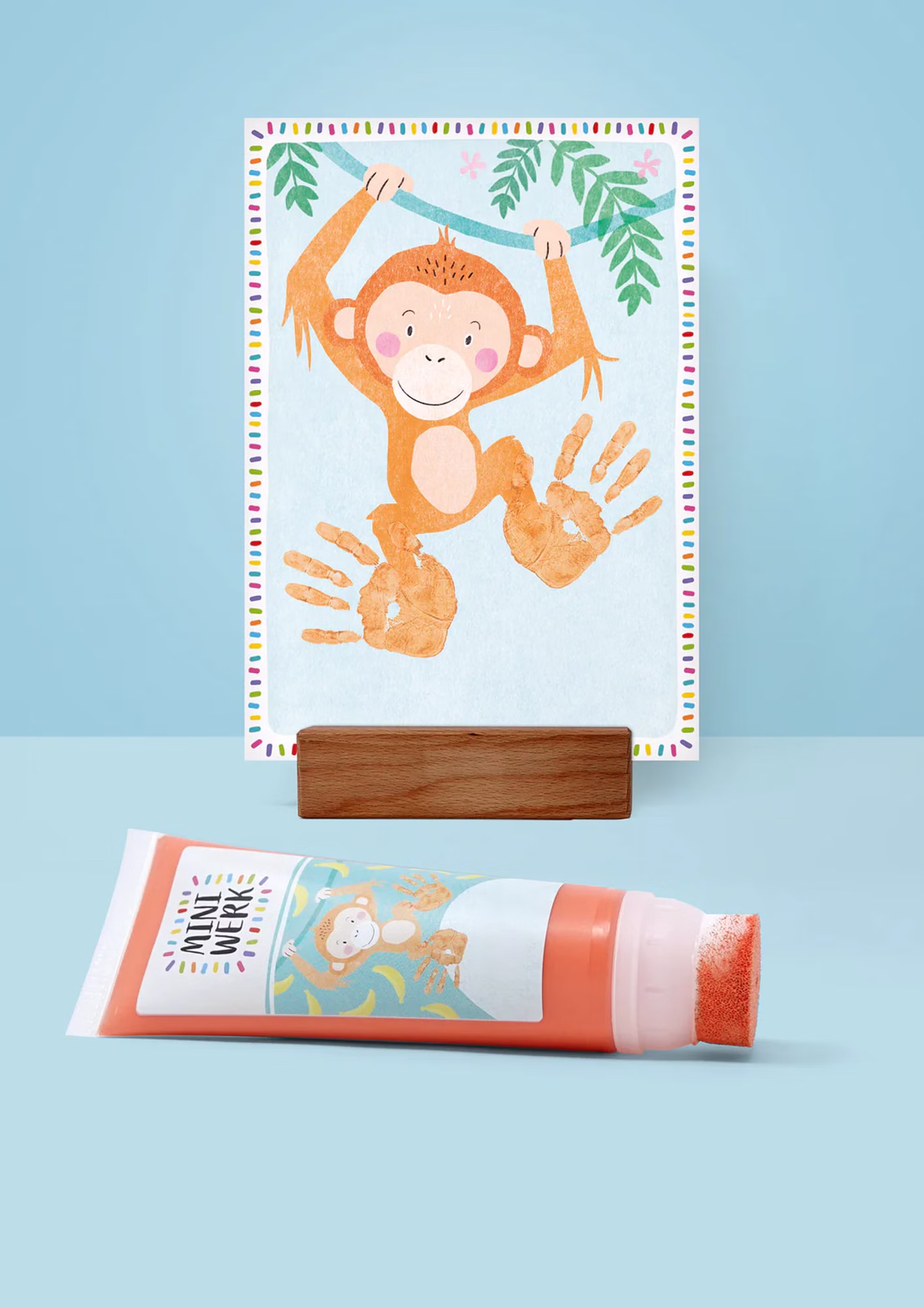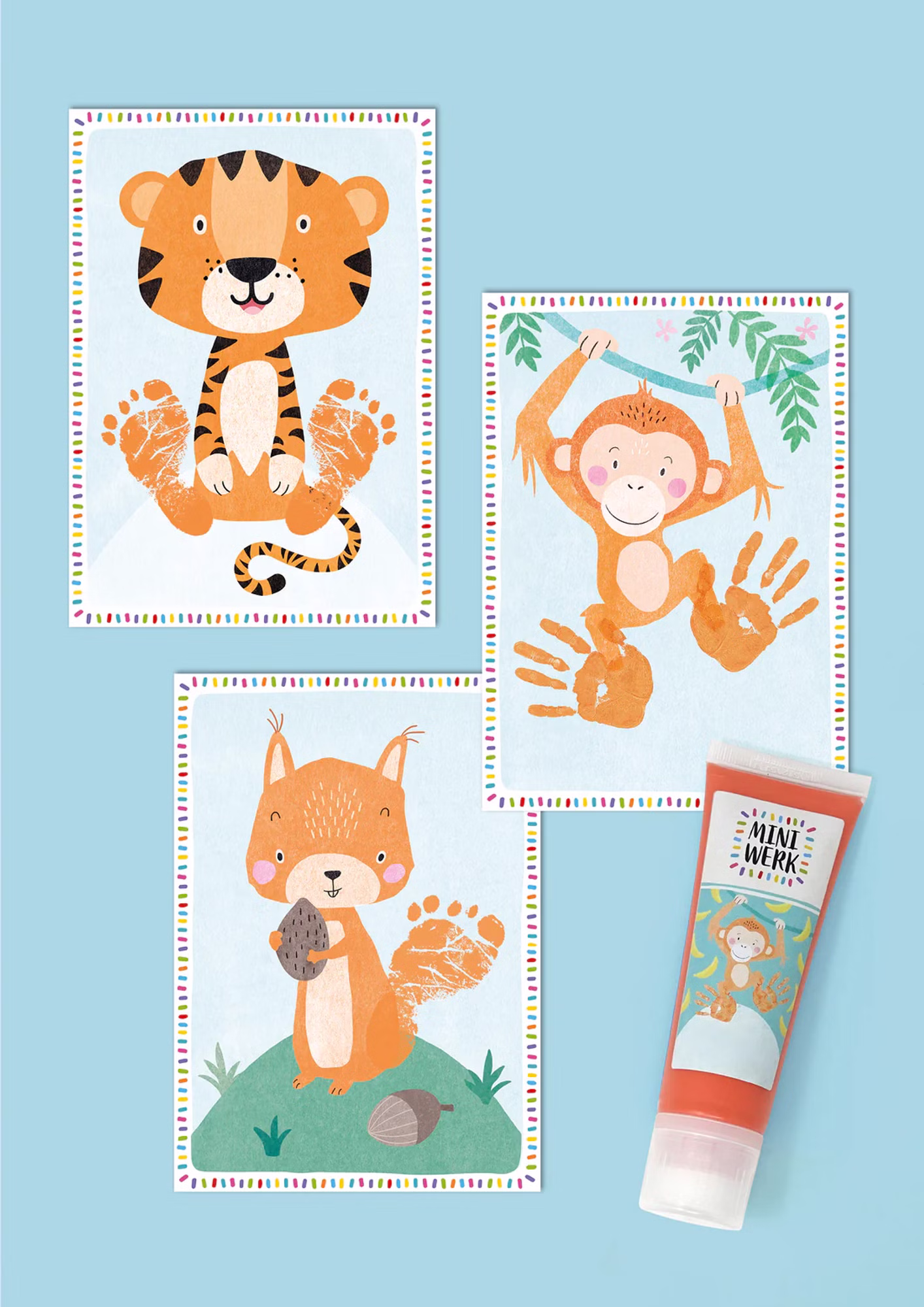 Mit den Abdrucksets sind der Fantasie keine Grenzen gesetzt: Ob zum Festhalten erster Hand- oder Fußabdrücke, zum Malen, Stempeln oder freien Gestalten – jedes Set lädt zum gemeinsamen Entdecken und Kreativsein ein. Die beiliegenden Tier-Motivkarten aus festem Naturkarton können, je nach Motiv, liebevoll mit Hand-, Finger- oder Fußabdrücken ergänzt und zu individuellen Kunstwerken ausgearbeitet werden. Sie verleihen den Abdrücken des Kindes einen ganz besonderen Rahmen und werden so zu wertvollen Erinnerungsschätzen.