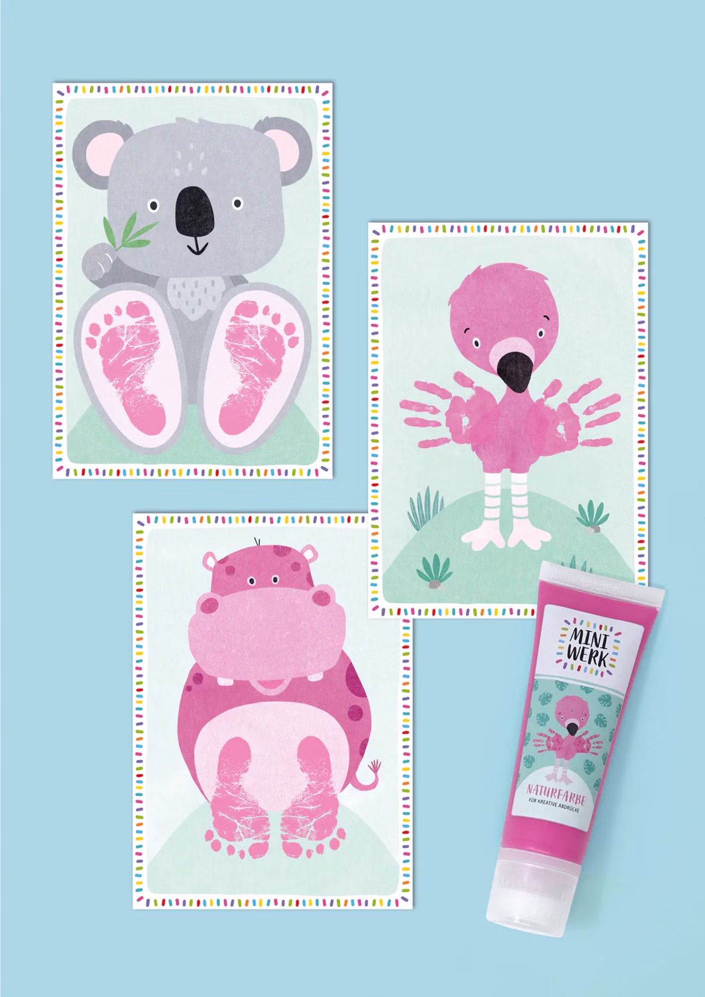 Mit den Abdrucksets sind der Fantasie keine Grenzen gesetzt: Ob zum Festhalten erster Hand- oder Fußabdrücke, zum Malen, Stempeln oder freien Gestalten – jedes Set lädt zum gemeinsamen Entdecken und Kreativsein ein. Die beiliegenden Tier-Motivkarten aus festem Naturkarton können, je nach Motiv, liebevoll mit Hand-, Finger- oder Fußabdrücken ergänzt und zu individuellen Kunstwerken ausgearbeitet werden. Sie verleihen den Abdrücken des Kindes einen ganz besonderen Rahmen und werden so zu wertvollen Erinnerungsschätzen.