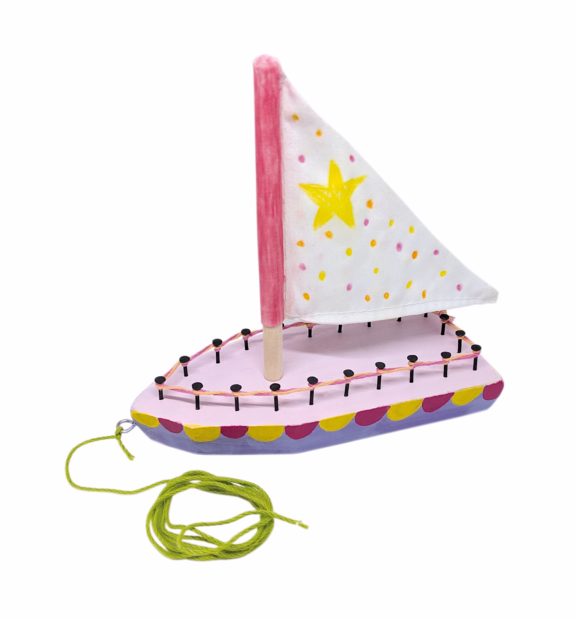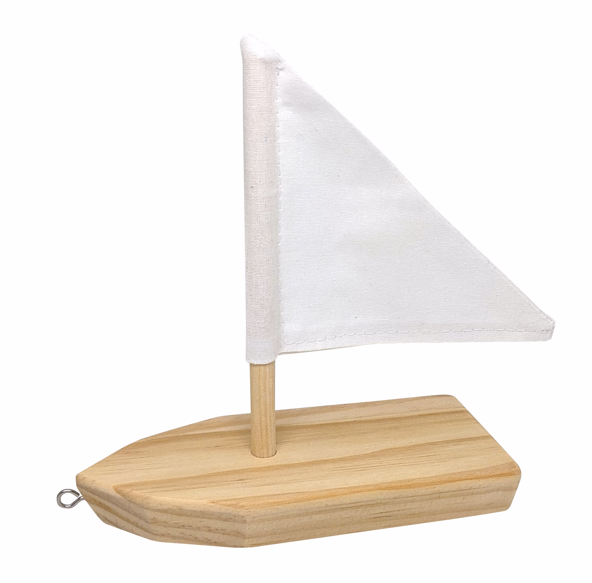 Der Schiffsrumpf aus Holz bildet eine stabile Grundlage, während der Holzmast und das Stoffsegel dem Boot seinen klassischen Segelboot-Charakter verleihen. Eine Öse zum Einschrauben ist ebenfalls enthalten und ermöglicht eine einfache Befestigung, zum Beispiel für eine Aufhängung oder Dekoration.