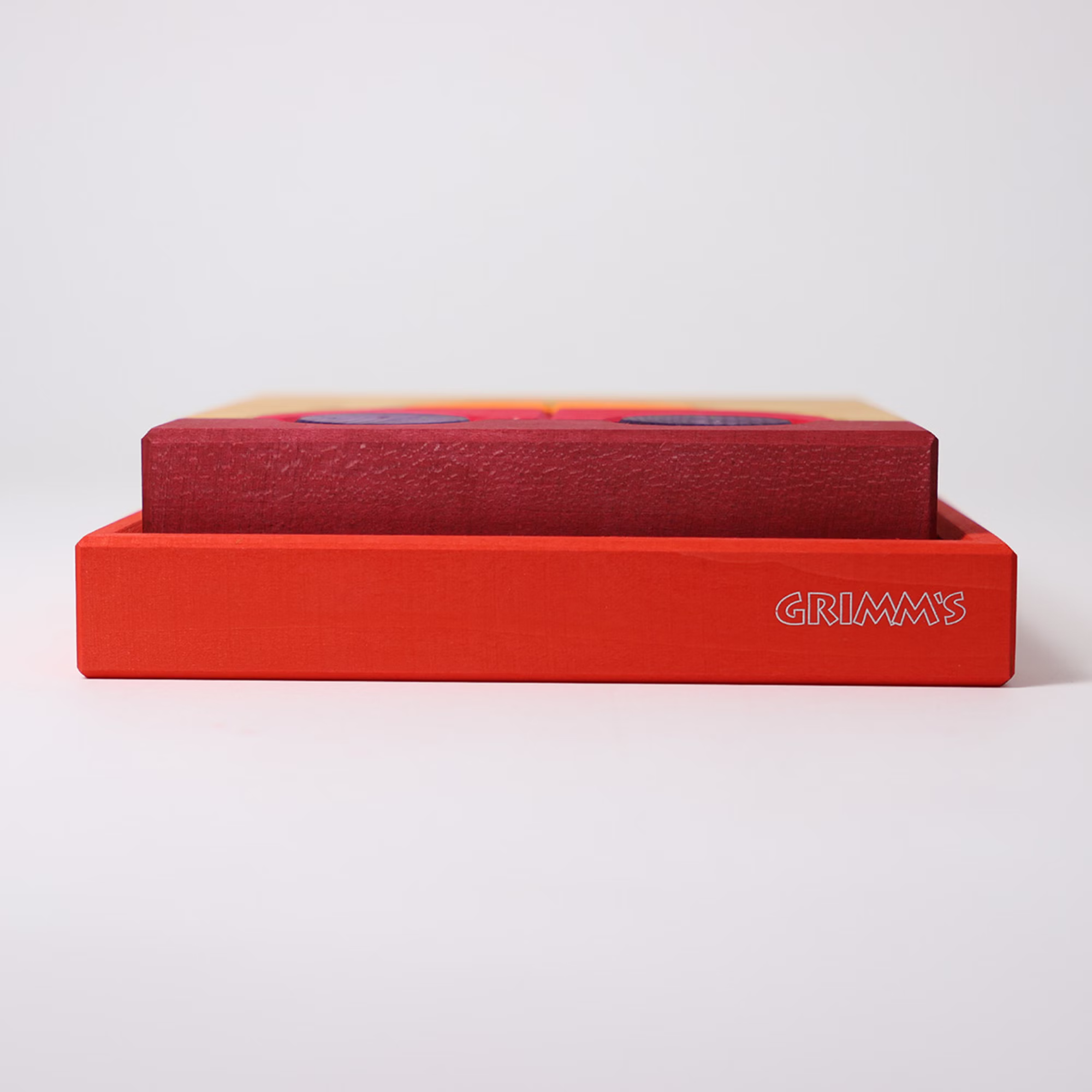 Aktiv und selbstbewusst lenkt das Auto in kräftigem Rot die Aufmerksamkeit auf sich. Außerhalb des Rahmens werden die symmetrischen Bausteine zu königlichen und farbintensiven Skulpturen. Das Bauspiel ist Teil der Grimms vier Farb-Bauspiele. Mit ihren großen Teilen sind sie gemacht für die kleinsten Hände. Die Farbvarianten ermöglichen ein erstes Heranführen an die Primär- und Sekundärfarben und deren unterschiedliche Wirkung.