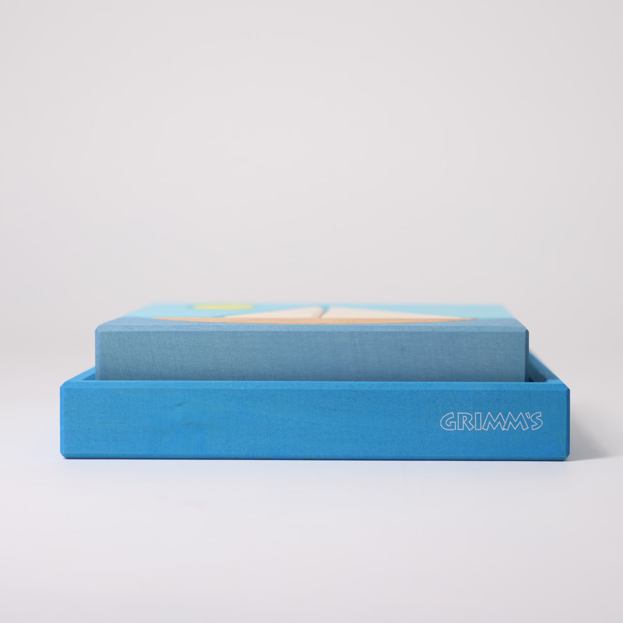 Getragen von sanften Wogen, gleitet das Segelboot über das beruhigende Blau des Meeres. Außerhalb des Rahmens werden die geometrischen Bausteine zu fantasievollen Tiergestalten. Dank ihrer großen Teile sind sie perfekt für die kleinsten Hände geeignet. Die verschiedenen Farben ermöglichen ein erstes Heranführen an die Primär- und Sekundärfarben und deren unterschiedliche Wirkung.