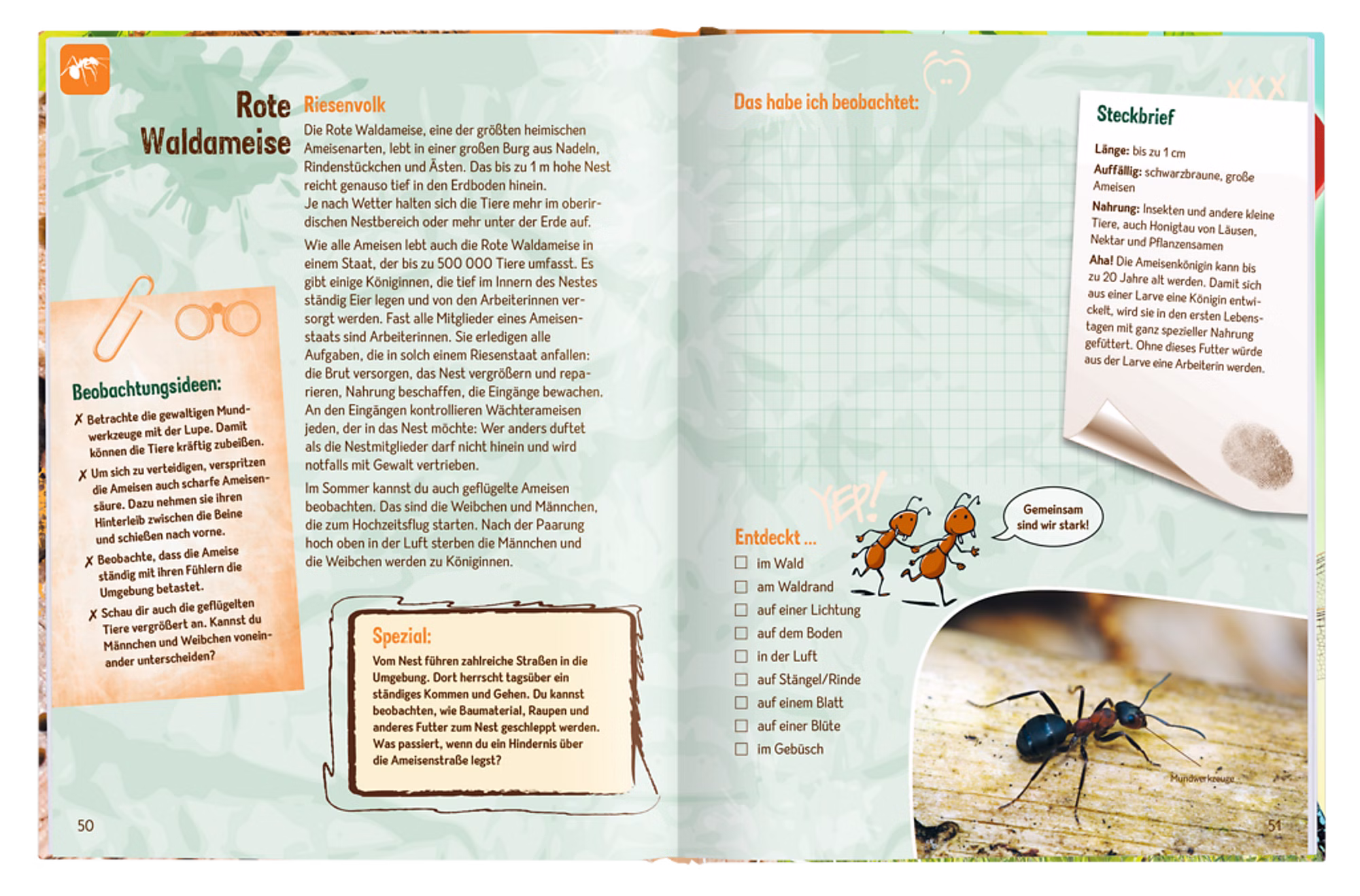 Am Ende des Buches wartet eine praktische Sammeltasche aus Papier, in der kleine Forscherinnen Blüten, Blätter oder Steinchen sammeln können. Ob allein, mit Freundinnen oder mit der Familie – das Buch beantwortet faszinierende Fragen wie: „Wie wird eine Kaulquappe zum Frosch?“ oder „Warum haben rote Waldameisen manchmal Flügel?“ und macht Naturerlebnisse erlebbar.