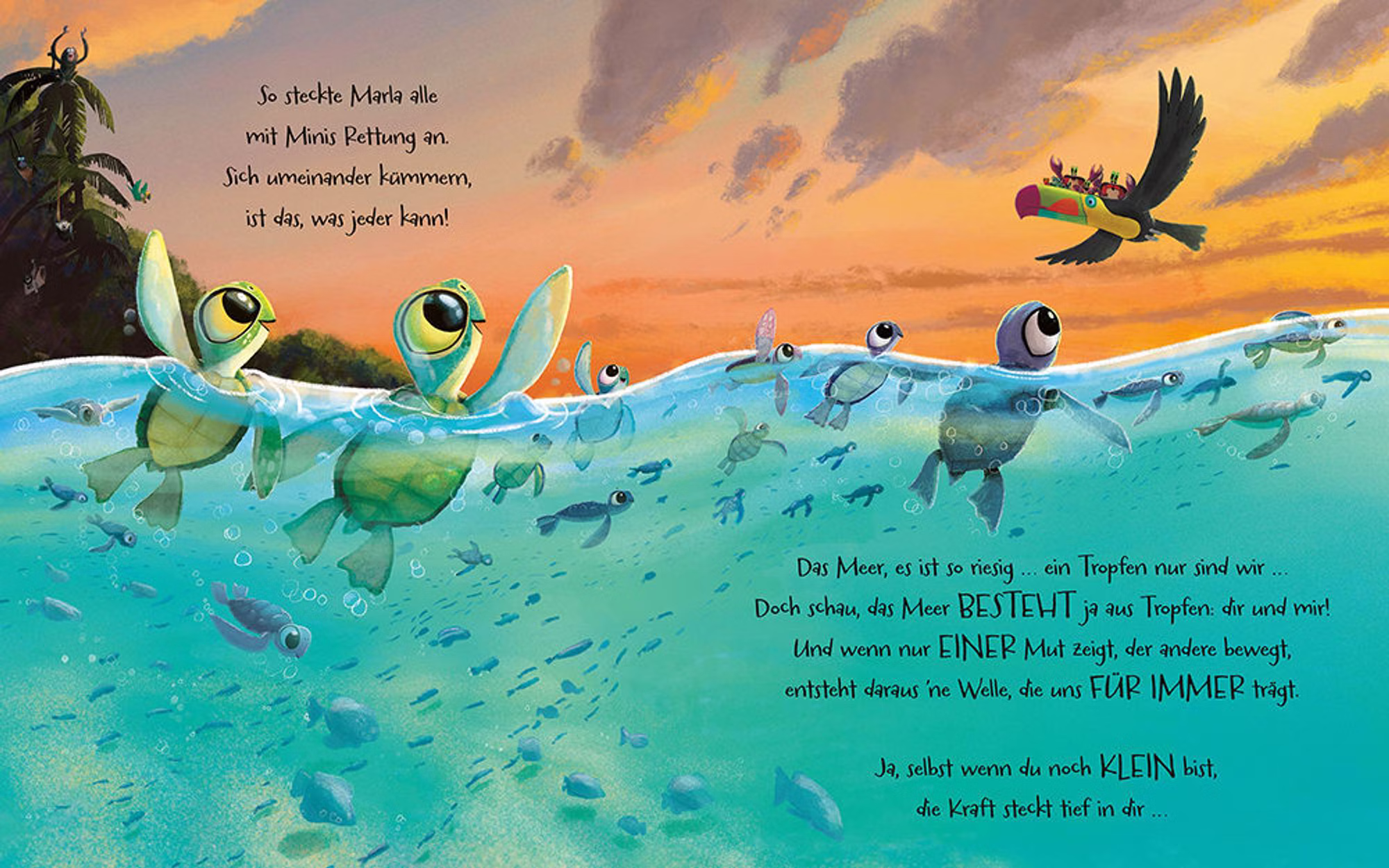 In der Nacht, in der die kleinen Meeresschildkröten schlüpfen, macht sich Marla auf den Weg zum rettenden Wasser. Doch ihr Bruder Mini ist plötzlich verschwunden. Marla muss eine mutige Entscheidung treffen – und erkennt dabei, dass auch die Kleinsten Großes bewirken können. Eine liebevoll gereimte Geschichte zum Vorlesen, die Mut macht und zeigt, wie wichtig Zusammenhalt ist.