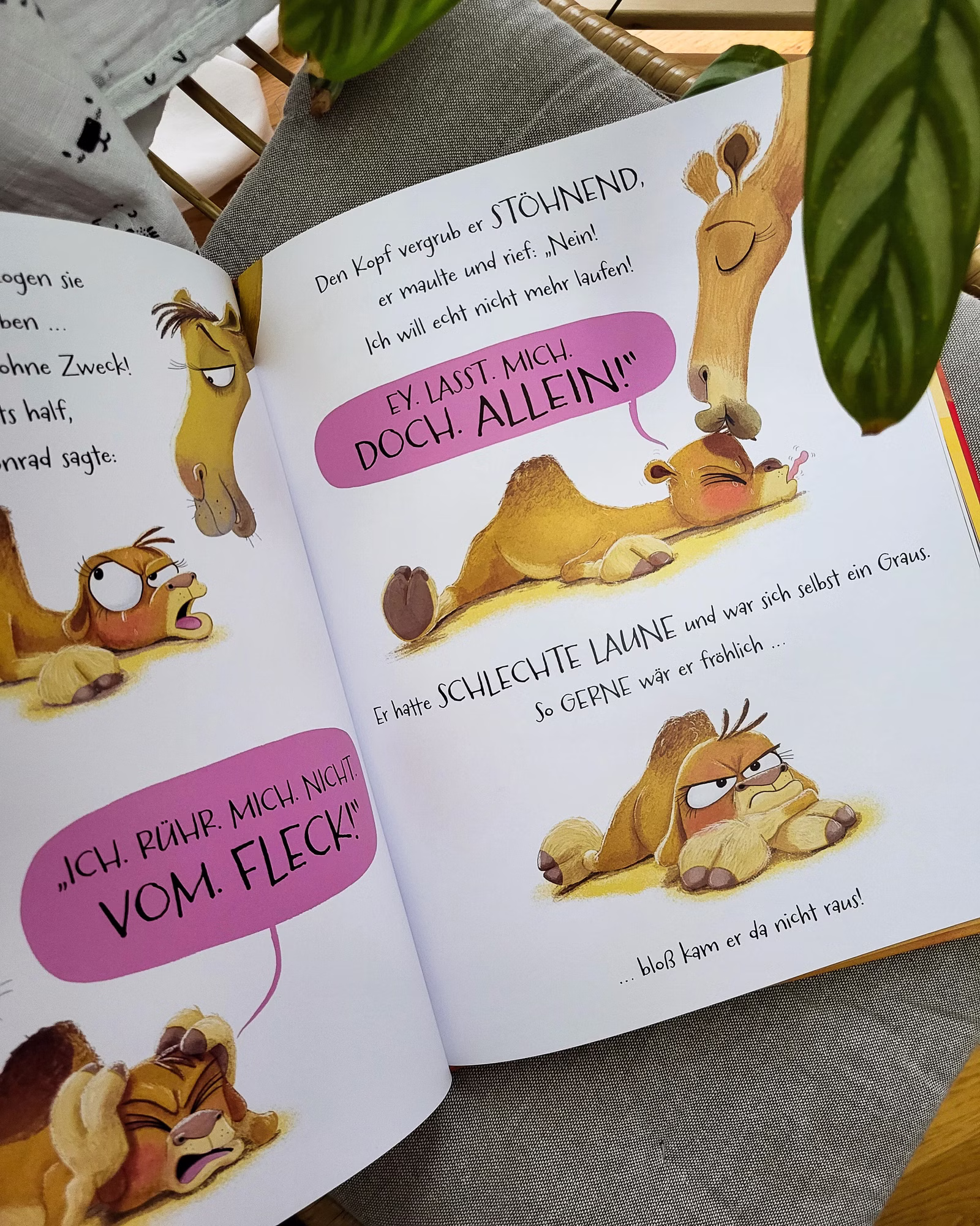 Als die Sonne über der Wüste aufgeht, erwacht das kleine Kamel Konrad und hat schlechte Laune. Ihm ist heiß, er ist müde, und auf keinen Fall will er zur Oase wandern. Sollen die anderen Kamele eben ohne ihn losziehen. Aber allein im heißen Sand ist es irgendwie auch blöd ... Da hoppelt plötzlich eine Wüstenspringmaus vorbei, die vor Fröhlichkeit nur so sprüht. Was ist wohl ihr Geheimnis? Könnte auch Konrad nur ein Lächeln von guter Laune entfernt sein?