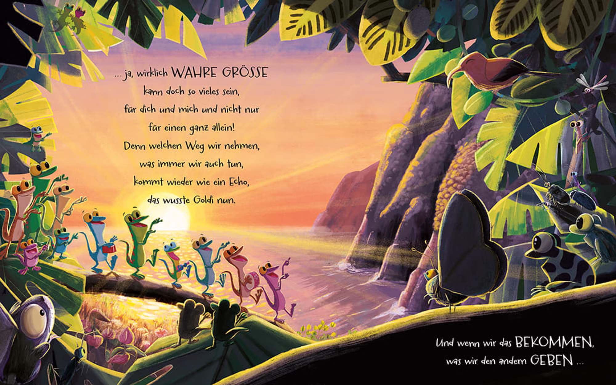 In einem fernen Inselparadies hat ein kleiner Gecko namens Goldi große Pläne. Er hält sich für etwas ganz Besonderes und bestimmt wird er einmal ein richtiger Star. Von früh bis spät und ohne Rücksicht auf andere, drängt Goldi sich gern in den Vordergrund. Bis er plötzlich allein dasteht und erkennt, dass sich nicht immer alles nur um ihn dreht. Vielleicht gibt es noch einen anderen Weg zum Glücklichsein?