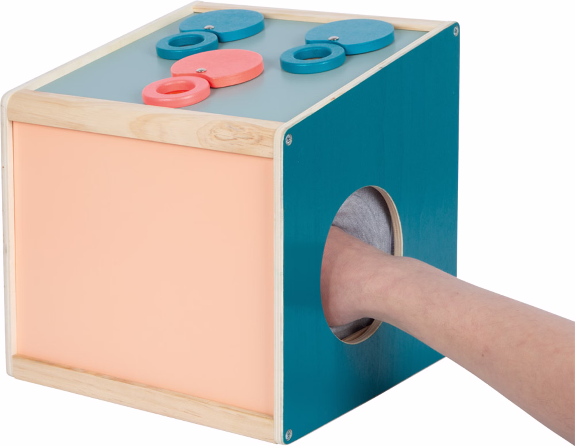 Diese großzügige Sinnes- und Fühlbox mit zwei seitlichen Öffnungen bietet vielfältige Möglichkeiten, um Gegenstände durch Tasten, Sehen, Riechen und Hören auf unterschiedlichen Wegen zu entdecken. Dabei erlauben eine Lupe, eine Facettenlinse und eine rote Linse eine neue Sicht auf die Gegenstände, die es im Inneren der Box zu erforschen gibt.