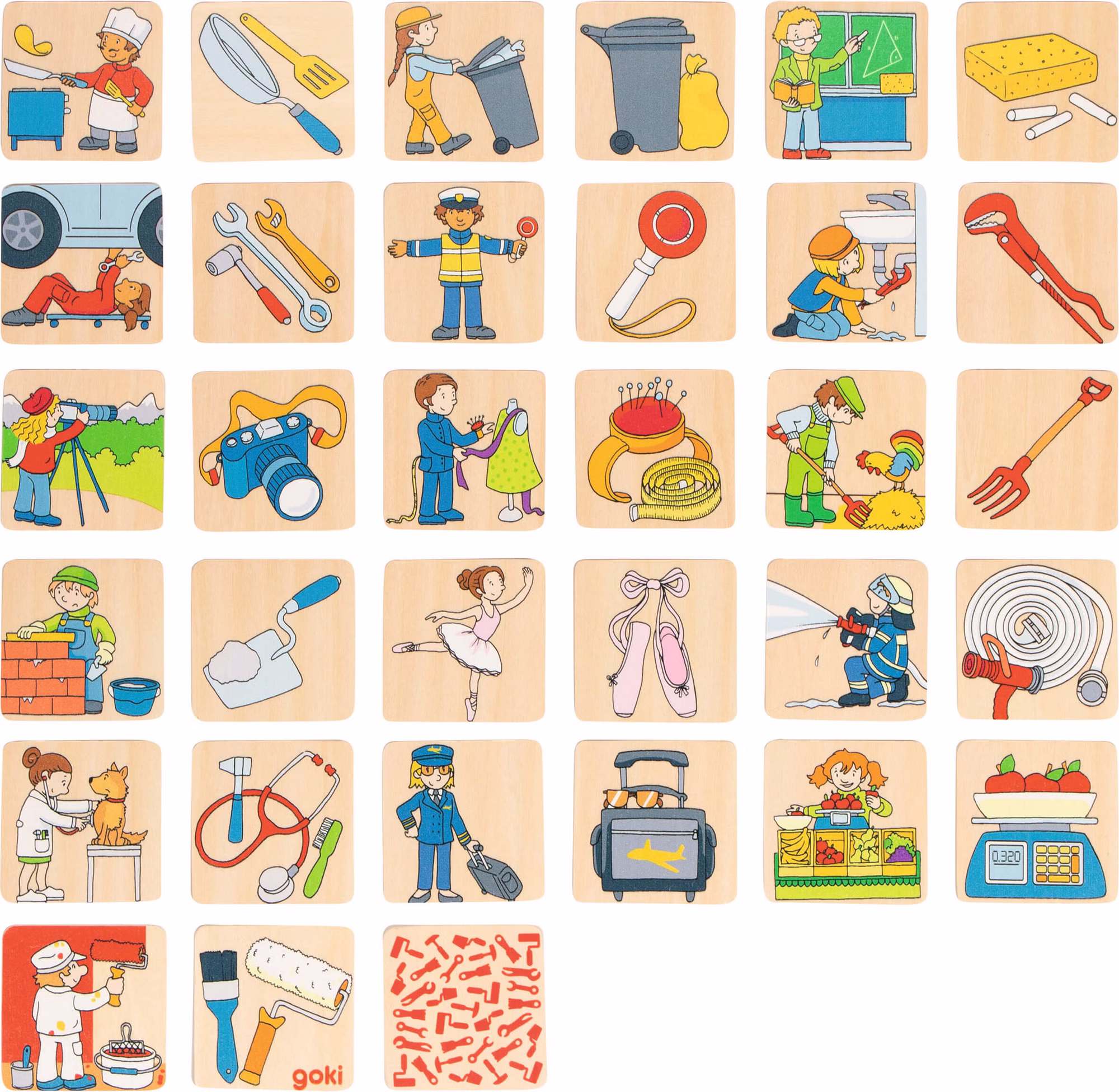 Die typischen Berufsutensilien müssen der entsprechenden Person einer Berufsgruppe zugeordnet werden. Da heißt es: Wissen was zusammengehört und natürlich an welcher Position die entsprechenden Karten liegen. Lernen, spielen und Spaß haben gehören bei diesem 32-teiligen Memospiel untrennbar zusammen.