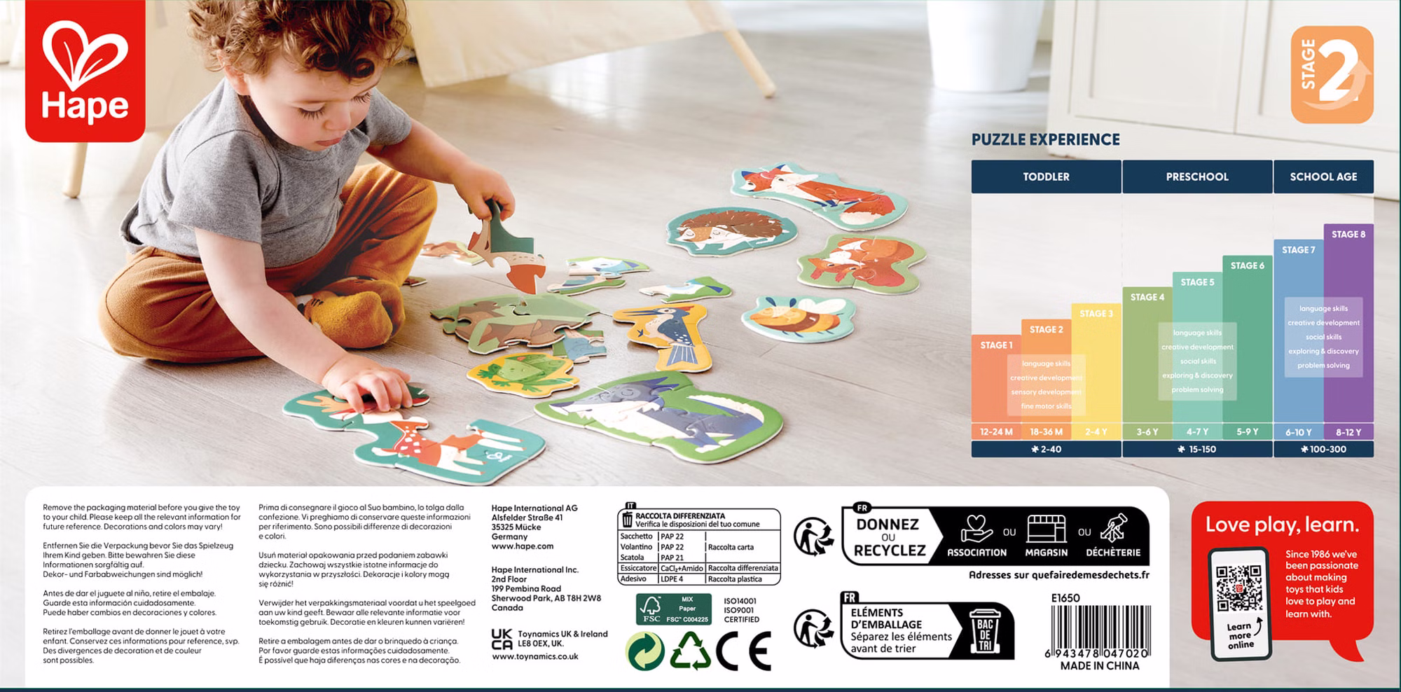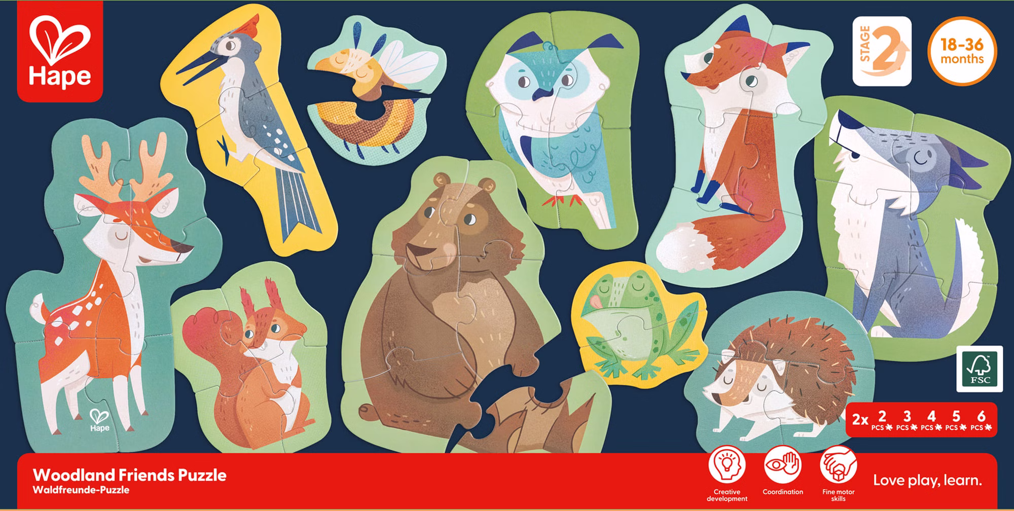 Das Set enthält zehn liebevoll gestaltete Puzzles mit max. 2-6 Teile pro Puzzle. Waldtieren wie Biene, Hirsch, Fuchs, Specht, Frosch, Bär, Eule, Eichhörnchen, Wolf und Igel. Beim Zusammensetzen lernen Kinder, Probleme zu lösen und erleben die positiven Ergebnisse ihrer Arbeit. Das stärkt ihr Selbstvertrauen und bereitet sie auf künftige, größere Herausforderungen vor.