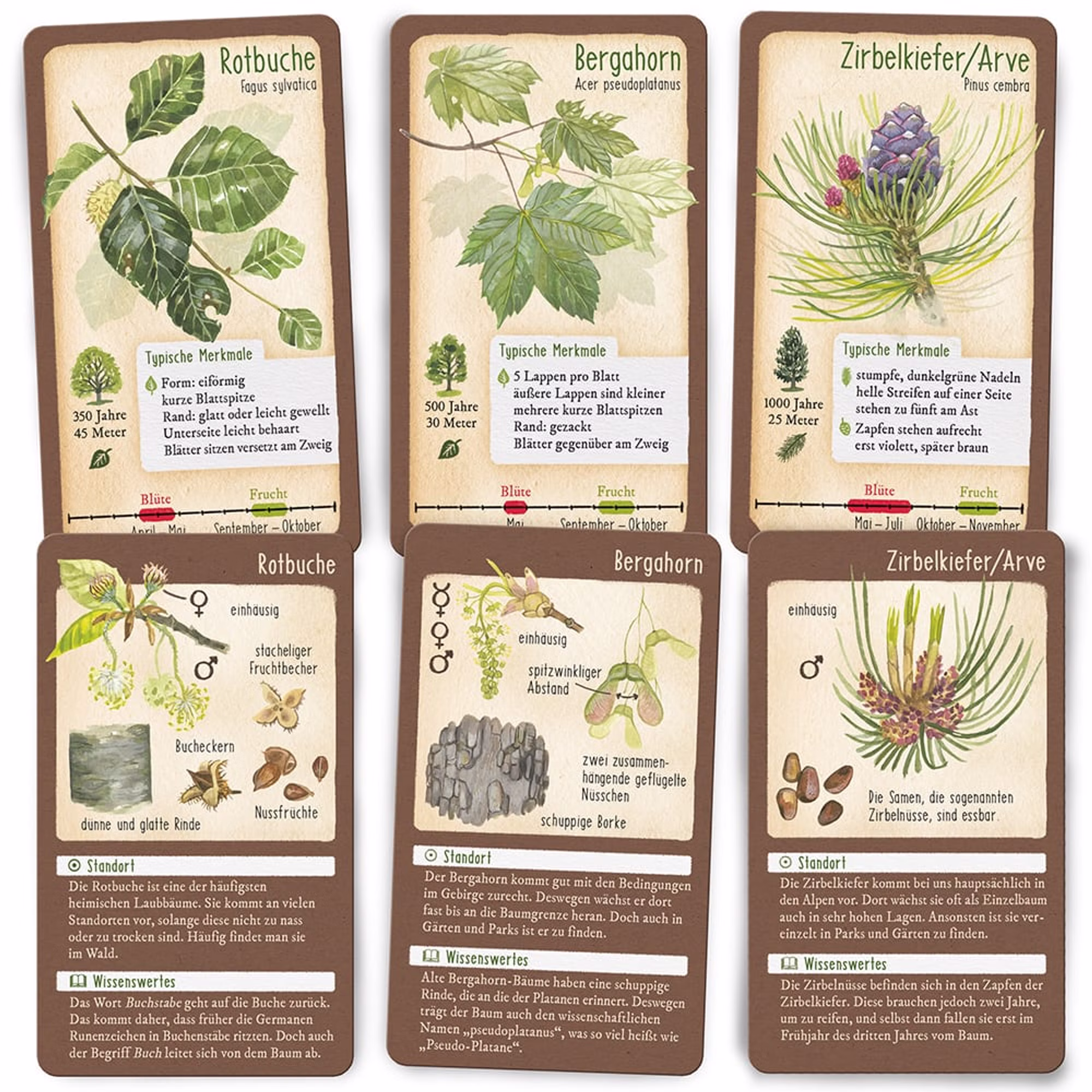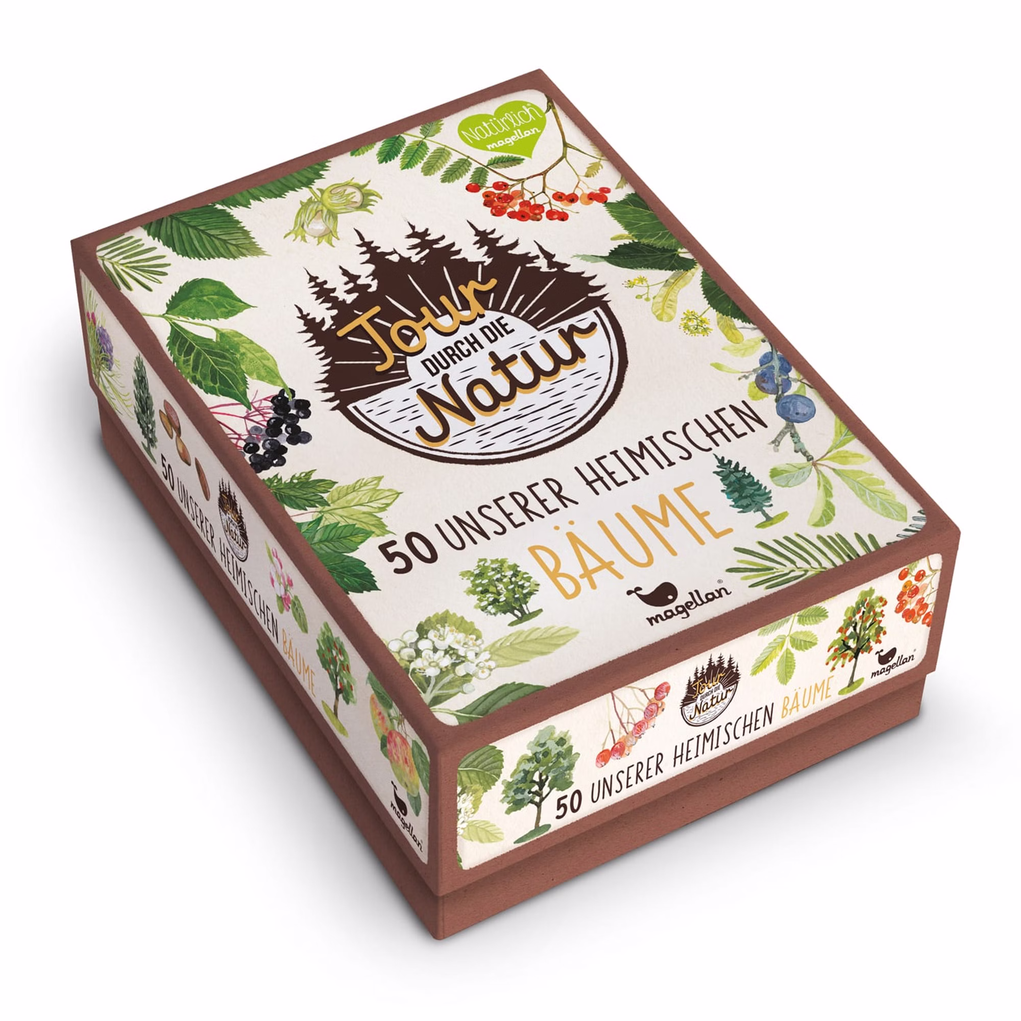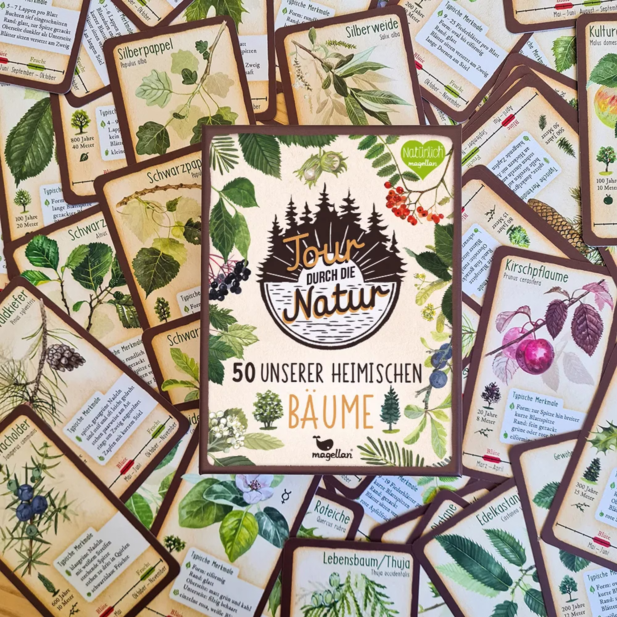 Die Natur entdecken und erleben – das ermöglicht das Baum-Set der neuen Naturkarten-Reihe. Mit zahlreichen Sachinformationen und wunderschönen, detailreichen Illustrationen ist es der perfekte Einstieg um spielerisch erstes Sachwissen über unsere heimischen Bäume zu erlernen. Im praktischen Mitnahmeformat sind die Karten ein idealer Begleiter für Erkundungstouren durch die Natur, dem heimischen Wald oder auch den eigenen Garten. Wer schon alle Bäume kennt, kann mit dem Kartenset "Tour durch die Natur - 50 heimische Singvögel" erkunden.