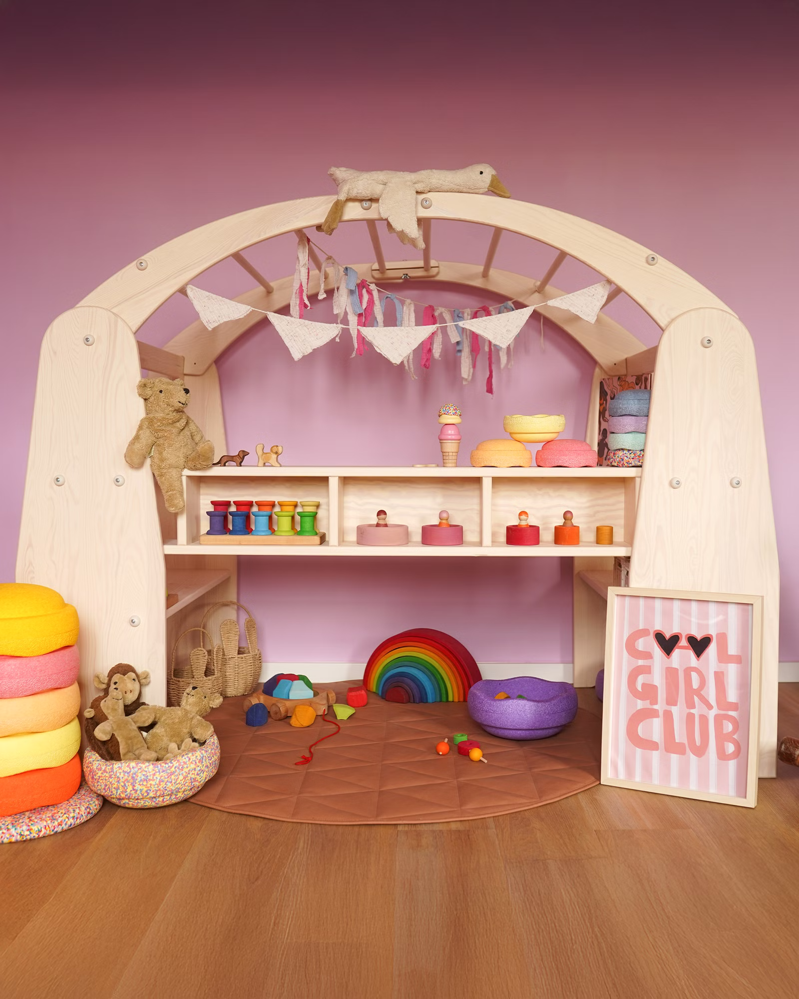 Der große Regenbogen ist ein sehr vielseitiges Spielzeug und schon für Krabbelkinder wunderbar zum Spielen geeignet! Die Kleinen stapeln, bauen und sortieren. Wenn die Kinder älter sind, bauen sie mit dem Regenbogen Puppenwiegen, Zäune, Tunnel, Brücken, Häuschen und Skulpturen. Der Regenbogen wird fantasievoll ins Spiel integriert und regt zu immer neuen Gestaltungsideen an.