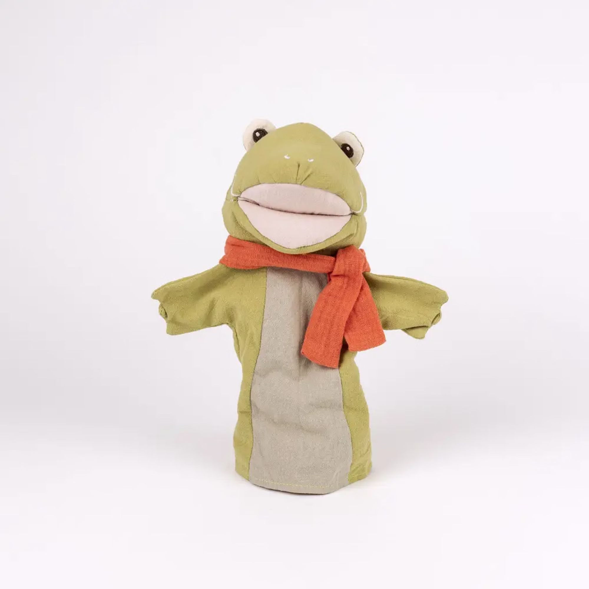 Ein sprechender Frosch! Die Hand wird in die Handpuppe aus Baumwolle gesteckt und der Mund wird im Rhythmus der Geschichte bewegt.