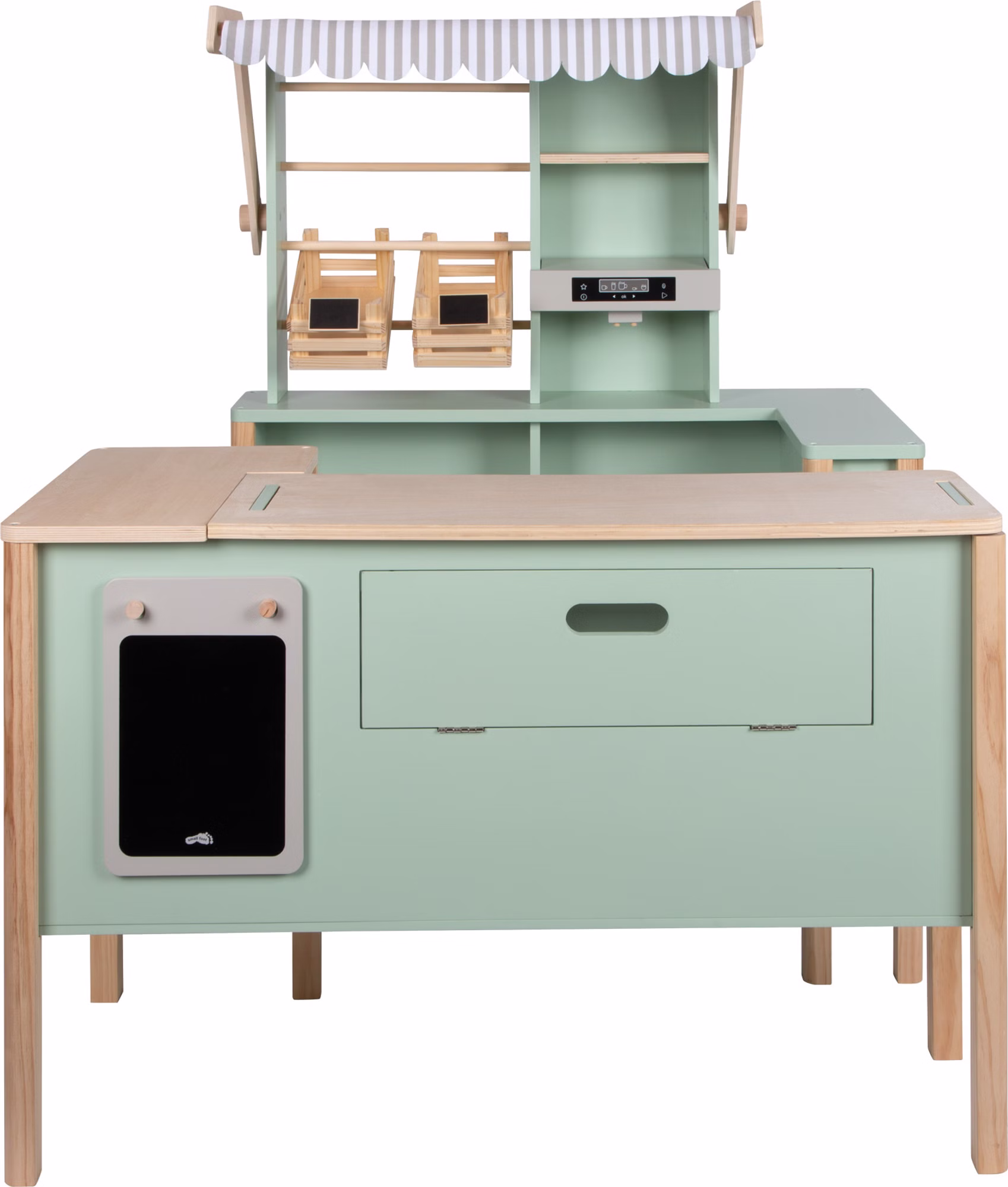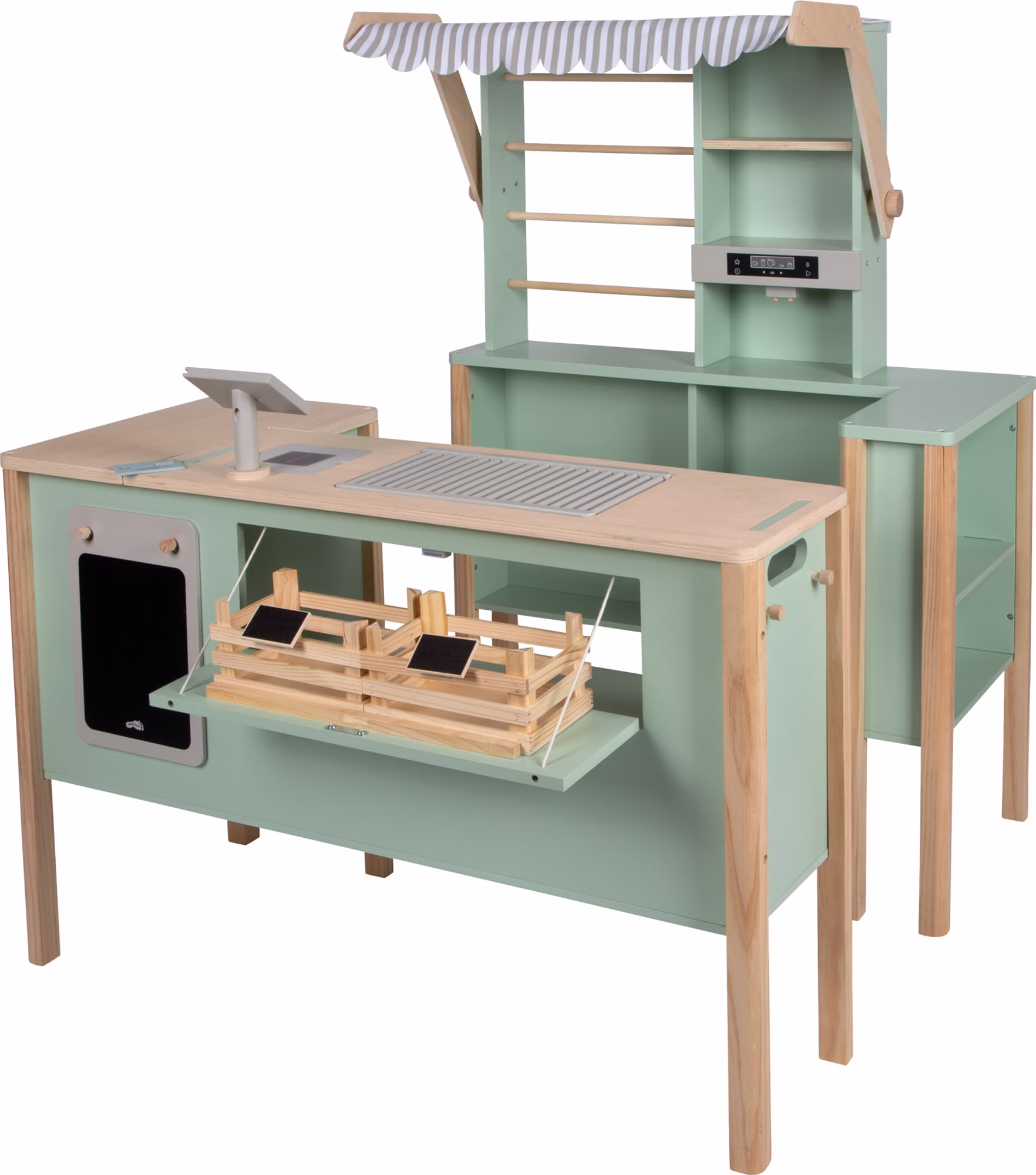 Liebevolle Details wie der abnehmbare Markisenbezug, Verkaufskörbe, Preisschilder und eine Angebotstafel sorgen für ein realistisches Spielerlebnis. Das nordisch inspirierte Design in modernem Pastellgrün macht diesen Alleskönner zudem zu einem stilvollen Blickfang. Ein langlebiges Spielzeug, das Kreativität, soziale Kompetenzen und Fantasie spielerisch fördert!