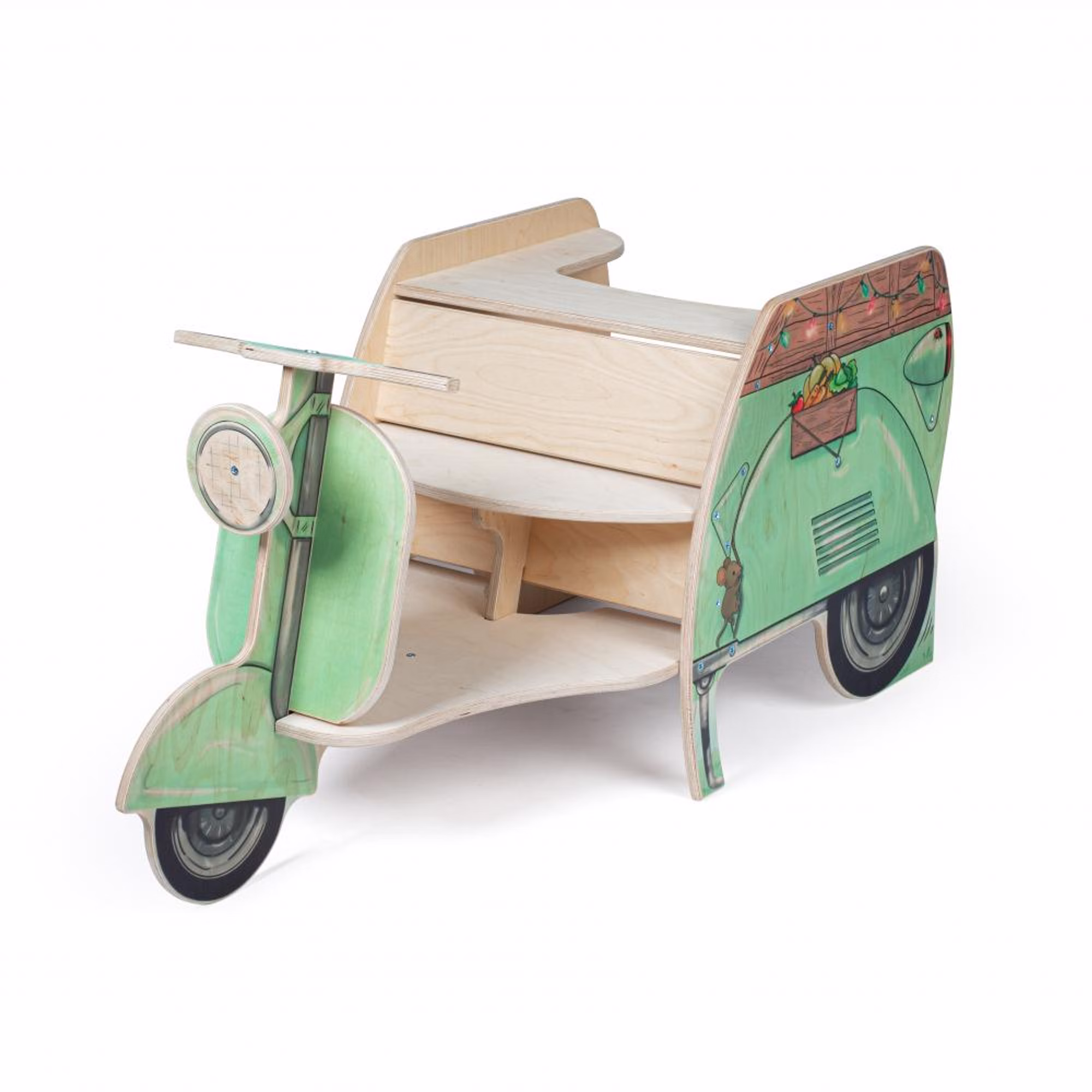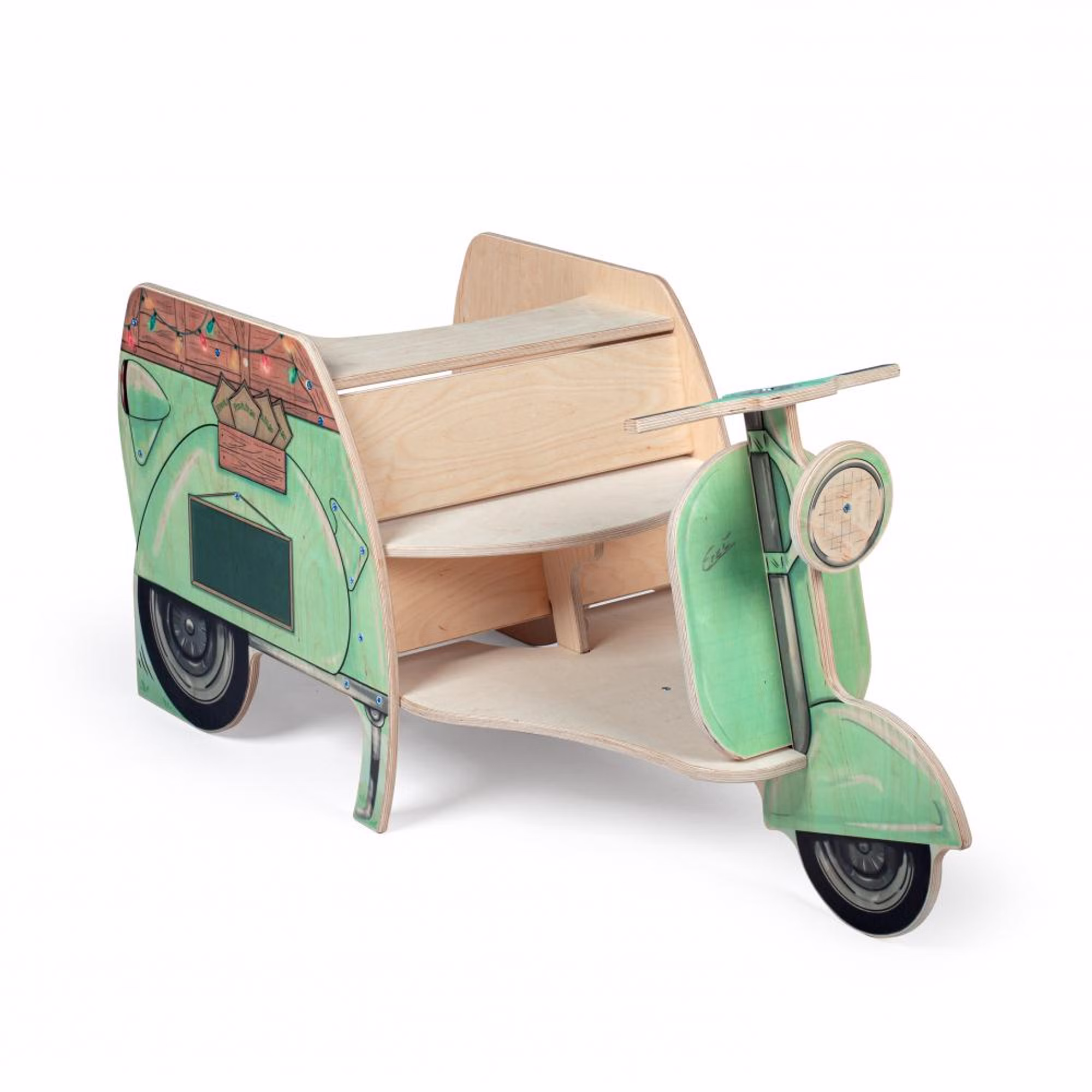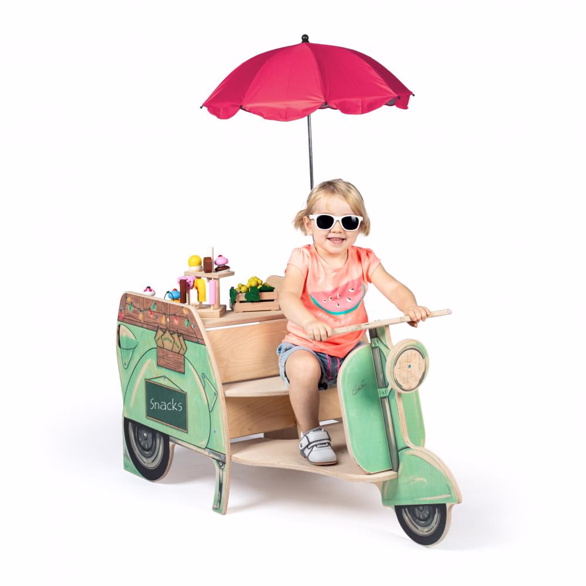 Der Streetfood Roller begeistert Kinder mit seinem charmanten Retro-Design und liebevoll gestalteten Details. Vorne können sie sitzen, lenken und auf Entdeckungstour gehen, während sich der hintere Bereich in einen vielseitigen Verkaufsstand verwandelt. Ob Eis, Bratwurst oder Obst – der Roller lädt zu kreativen Rollenspielen ein und bietet im großzügigen Verkaufsbereich viel Platz für eigene Ideen.