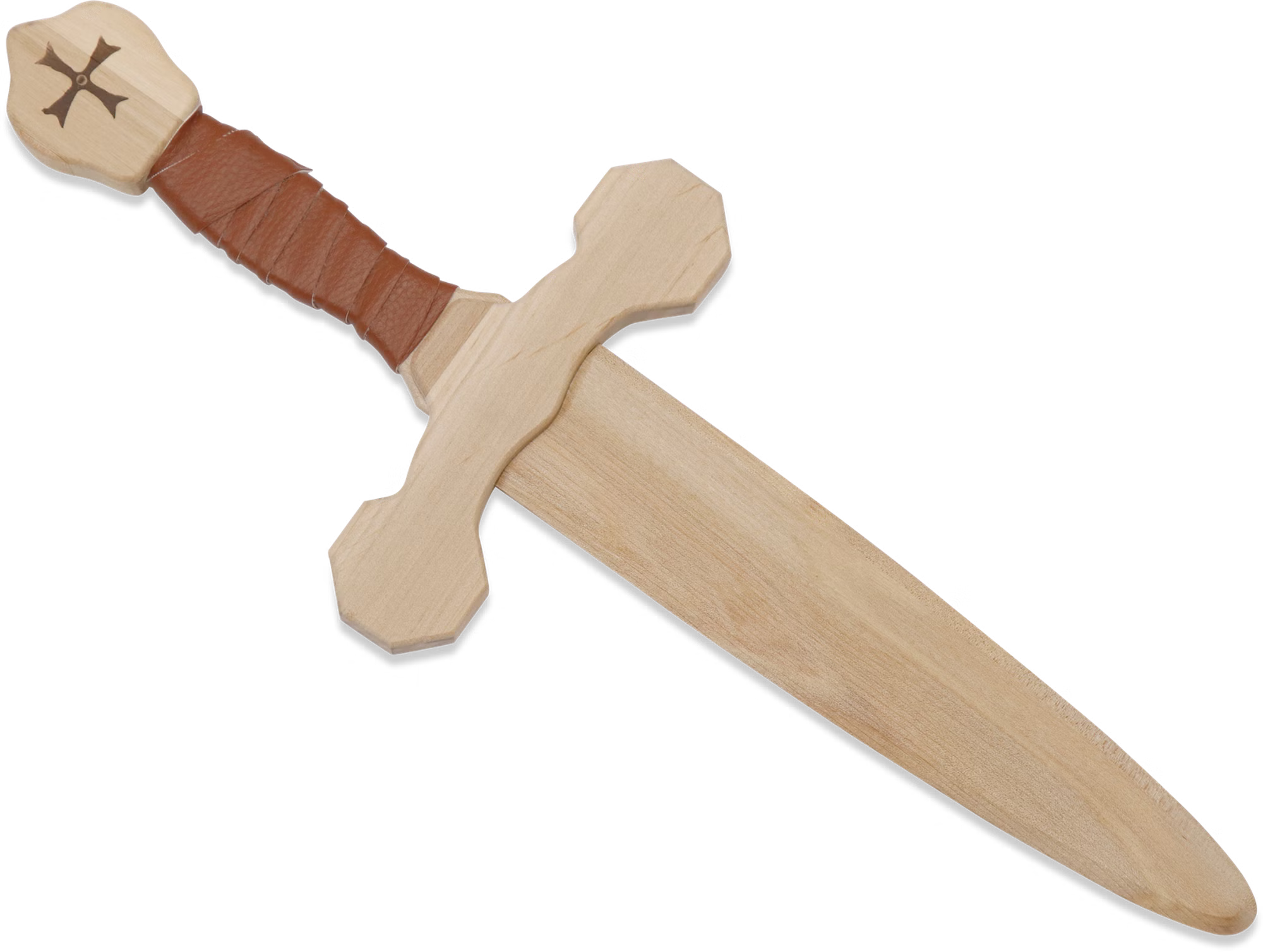 Der Ritterdolch ist mit unterfüttertem Kunstleder umwickelt, den Knauf des Griffes schmückt ein eingebranntes Kreuz.