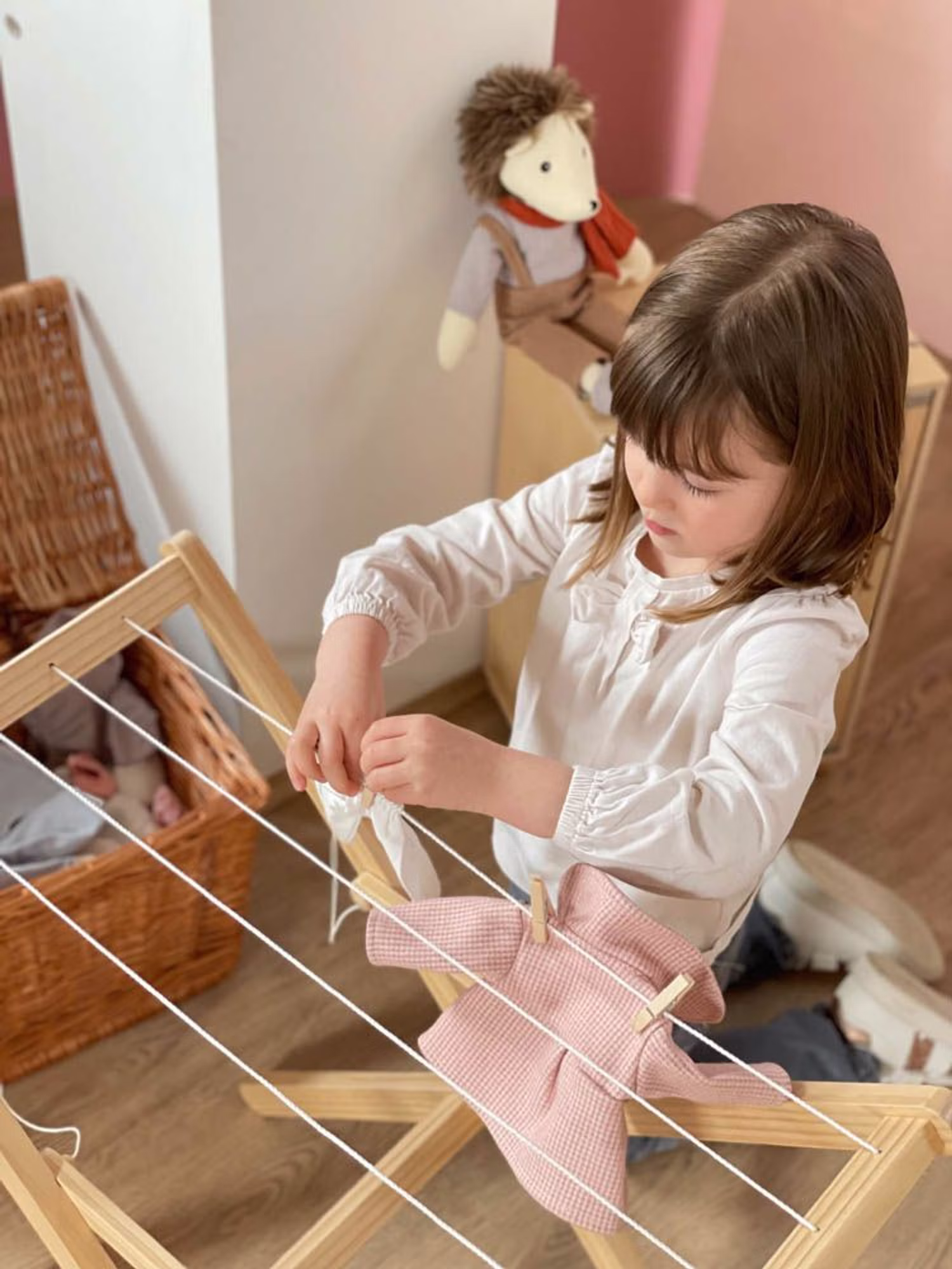 Perfekt für jeden Kinderhaushalt. Ein schöner und stabiler Wäscheständer aus Massivholz zum Aufhängen aller Puppenkleider. Durch die kindgerechte Arbeitshöhe ist der Wäscheständer ein ideales Rollenspielzeug, um Eltern im Haushalt nachzuahmen und Kinder spielerisch für alltägliche Aufgaben zu begeistern.