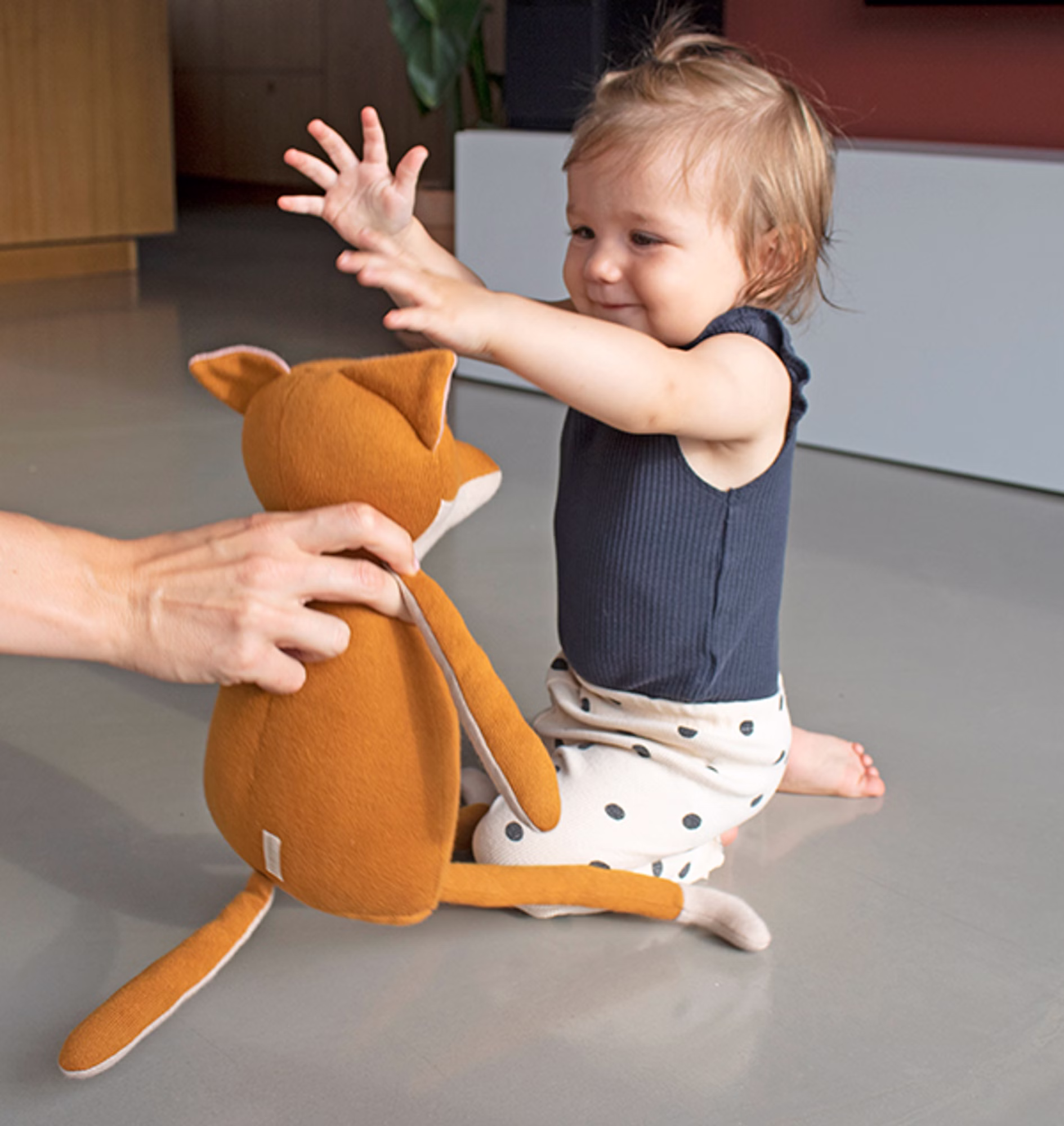 Mit seinem süßen Gesicht baut das Kuscheltier schnell eine Beziehung zum Baby auf.