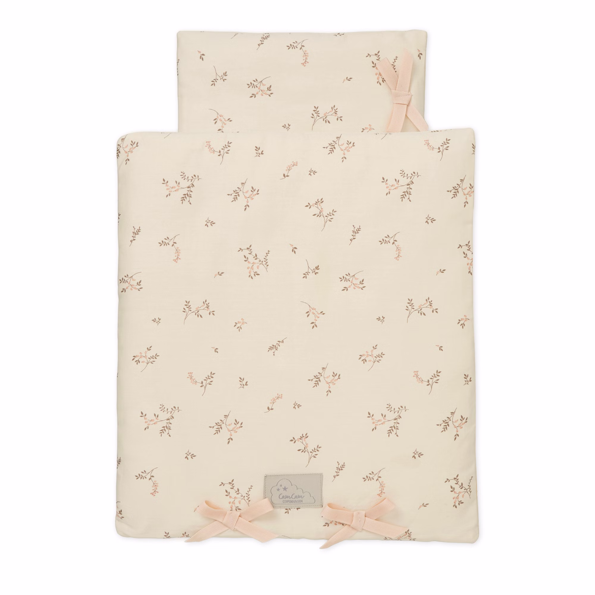 Hübsches Puppenbettwäsche Set aus 100% GOTS-zertifizierter Bio-Baumwolle. Das Set besteht aus einer Puppendecke und einem Kissen, beide mit biologischer Füllung. Kleine Schleifchen sind als extra Detail am unteren Rand angebracht. Der Bezug kann mit einem Reißverschluss abgenommen und gewaschen werden.