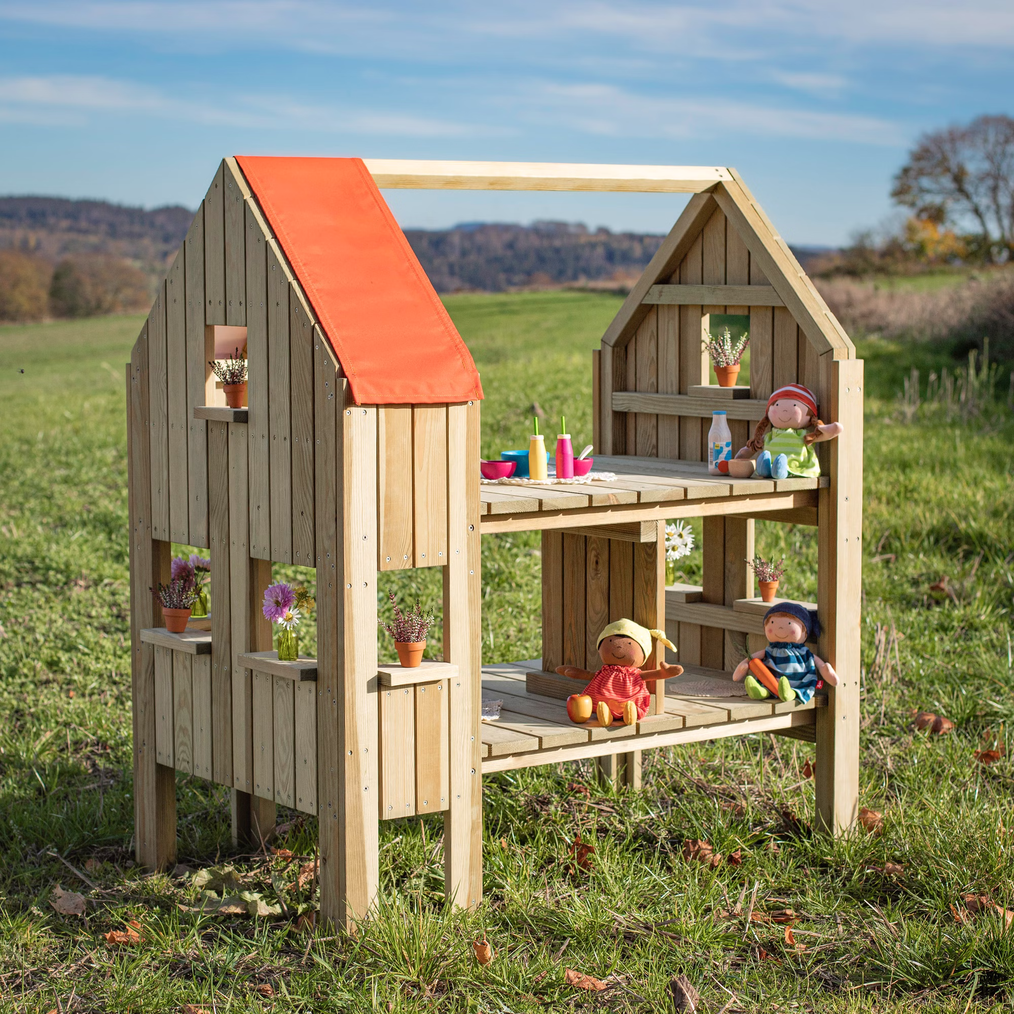 Durch die robuste Bauweise und Imprägnierung ist das Haus zum Spielen unter freiem Himmel geeignet und bietet langjährigen Spielspaß. Es ist gleichzeitig von mehreren Kindern beidseitig bespielbar.
