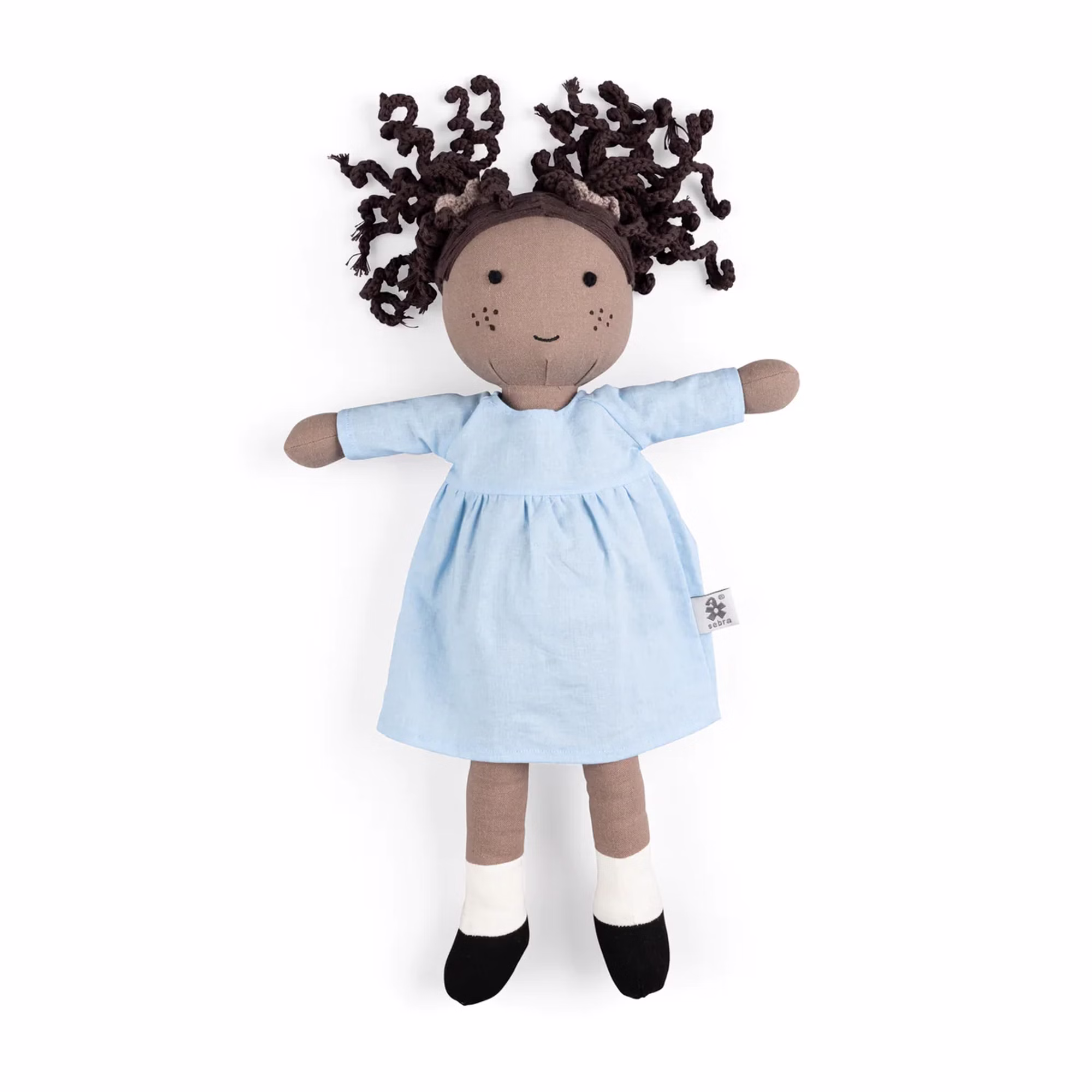 Ihr Körper und ihr Kleid sind aus Baumwolle und Leinen gefertigt und ihr hübsches dunkles Haar ist gehäkelt. Poppy misst 43 cm in der Länge und ist mit weichem, recyceltem Polyester gefüllt. Die Stoffpuppe trägt ein hübsches hellblaues Kleid, das beim Spielen leicht gewechselt werden kann und ihre niedlichen Sommersprossen sind auf ihren Wangen aufgestickt.