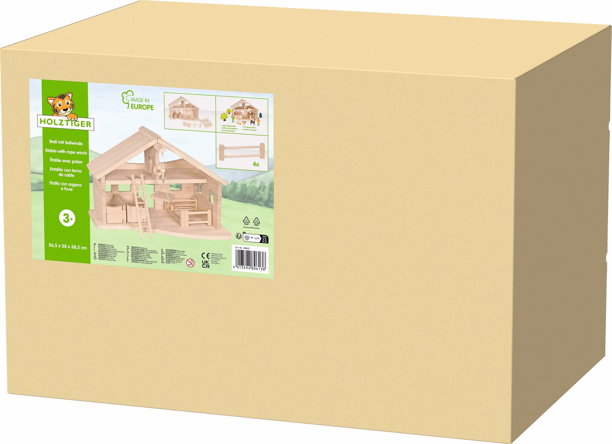 Der Stall überzeugt durch seine stabile Verarbeitung und liebevollen Details. Bewegliche Gatter, Zaunelemente, Futterkrippe, Bodenleiter und eine voll funktionsfähige Seilwinde sorgen für realistischen Spielspaß und zahlreiche Gestaltungsmöglichkeiten. Ein robustes Spielset, das Kinder zu fantasievollen Rollenspielen einlädt und dank bester Handwerkskunst viele Jahre Freude bereitet.