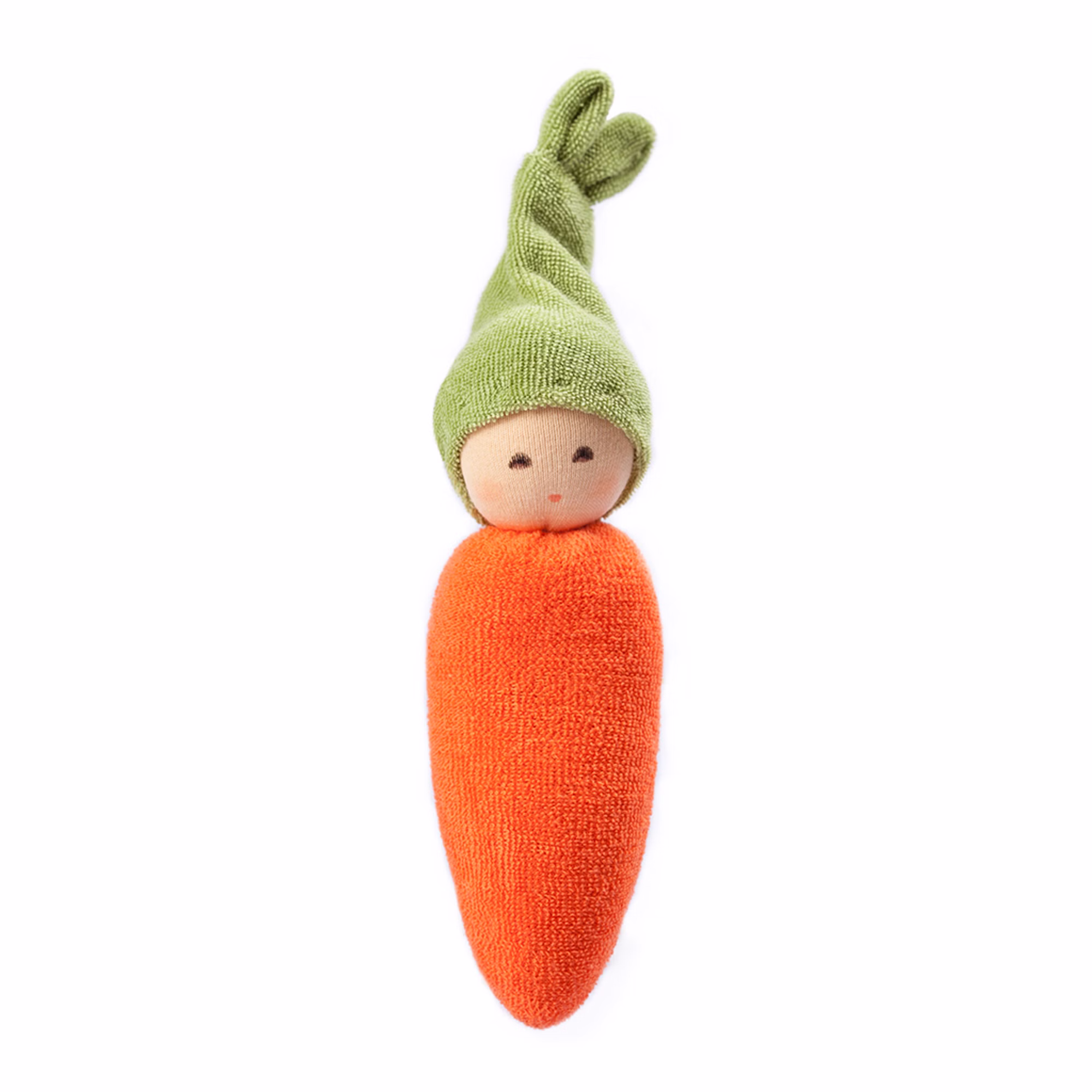 Speziell für kleine Hände. Bio-Baumwollfrottee gefüllt mit Bio-Schafschurwolle. So bleibt das junge Gemüse immer frisch, fordert Baby zu ersten Greifversuchen auf und lässt sich bedenkenlos in den Mund nehmen. Das niedliche Möhrchen rasselt ganz sanft und leise.
