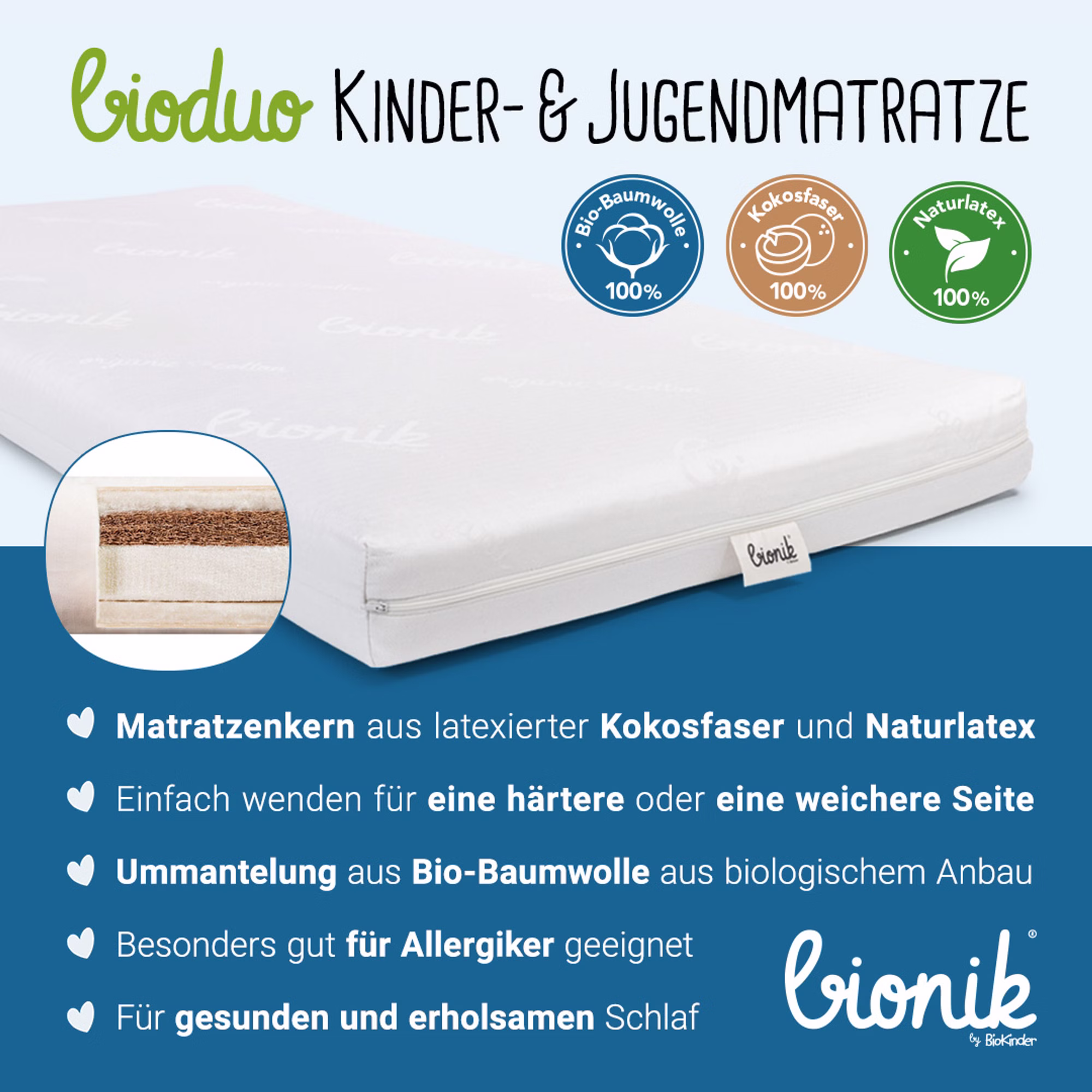 Die bionik Bioduo Kinder- und Jugendmatratze mit einem Kern aus 5 cm latexierter Kokosfaser und 5 cm Naturlatex ist zum Wenden und bietet Kindern und Heranwachsenden die Option einer härteren und einer weicheren Seite, ganz nach Alter und persönlicher Vorliebe.