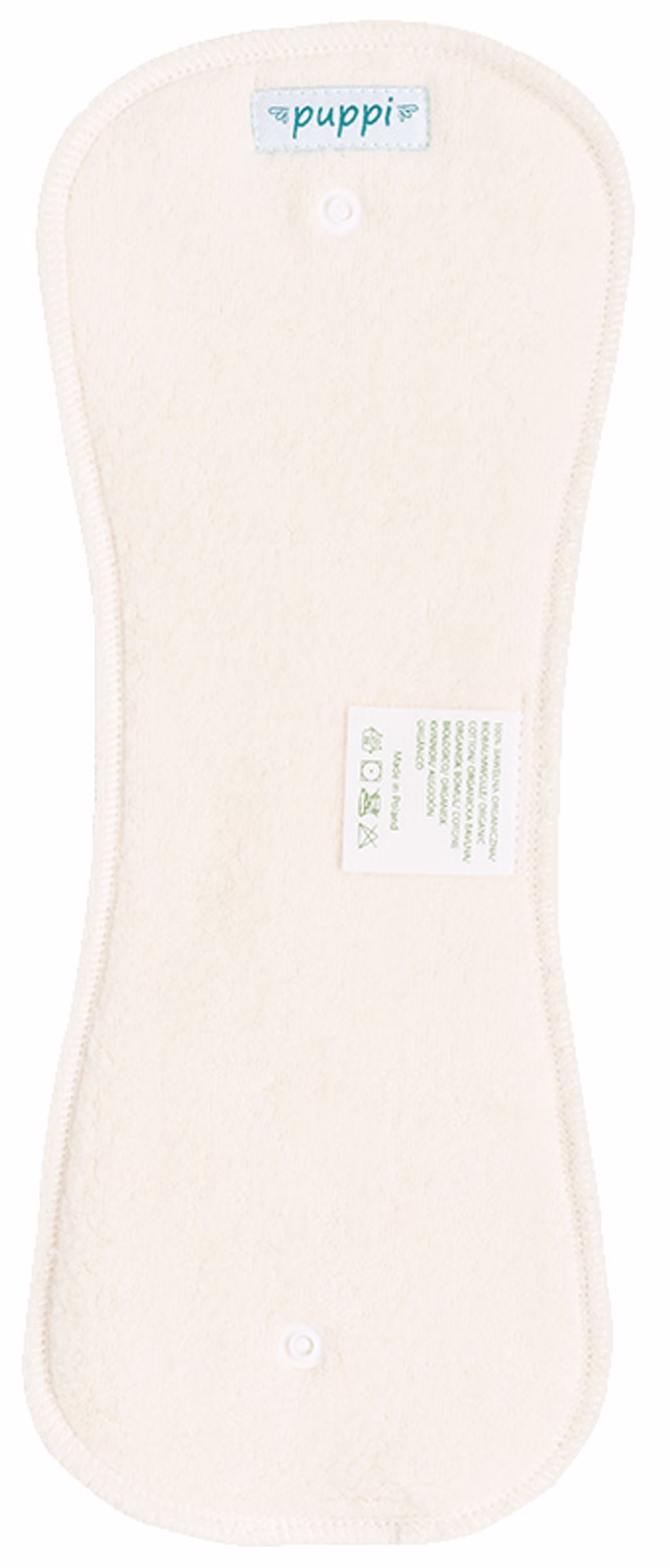 Über Druckknöpfe lässt sich die Einlage in einer Woll-Überhosen befestigen oder an andere Einlagen knöpfen um die Saugkraft zu verstärken wenn Bedarf besteht (z.B. in der Nacht).